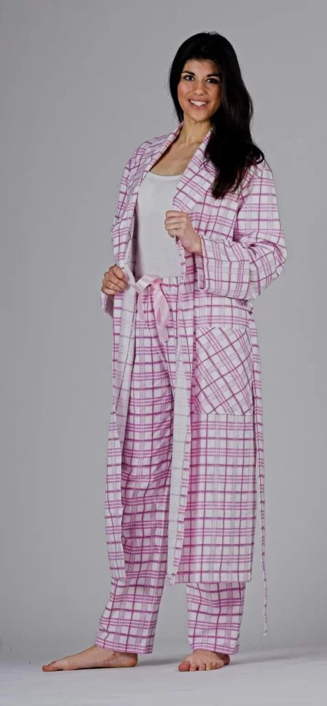Dámský kostkovaný župan v délce pod kolena, s kapsami, páskem, se šálovým lýmcem. Barvy růžová nebo žlutá. Materiál: flanel 150g/m2
