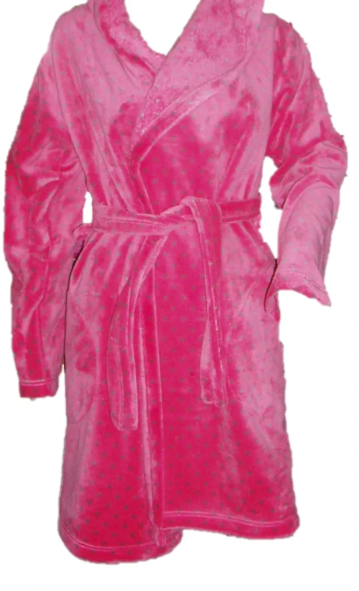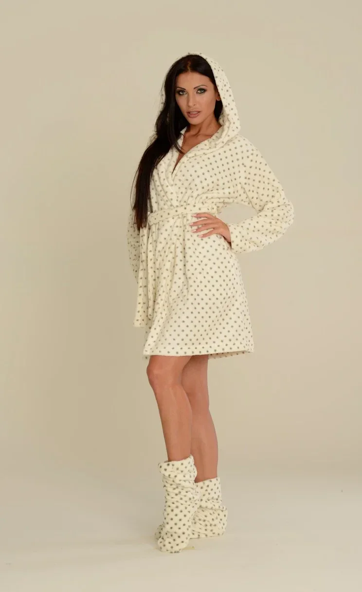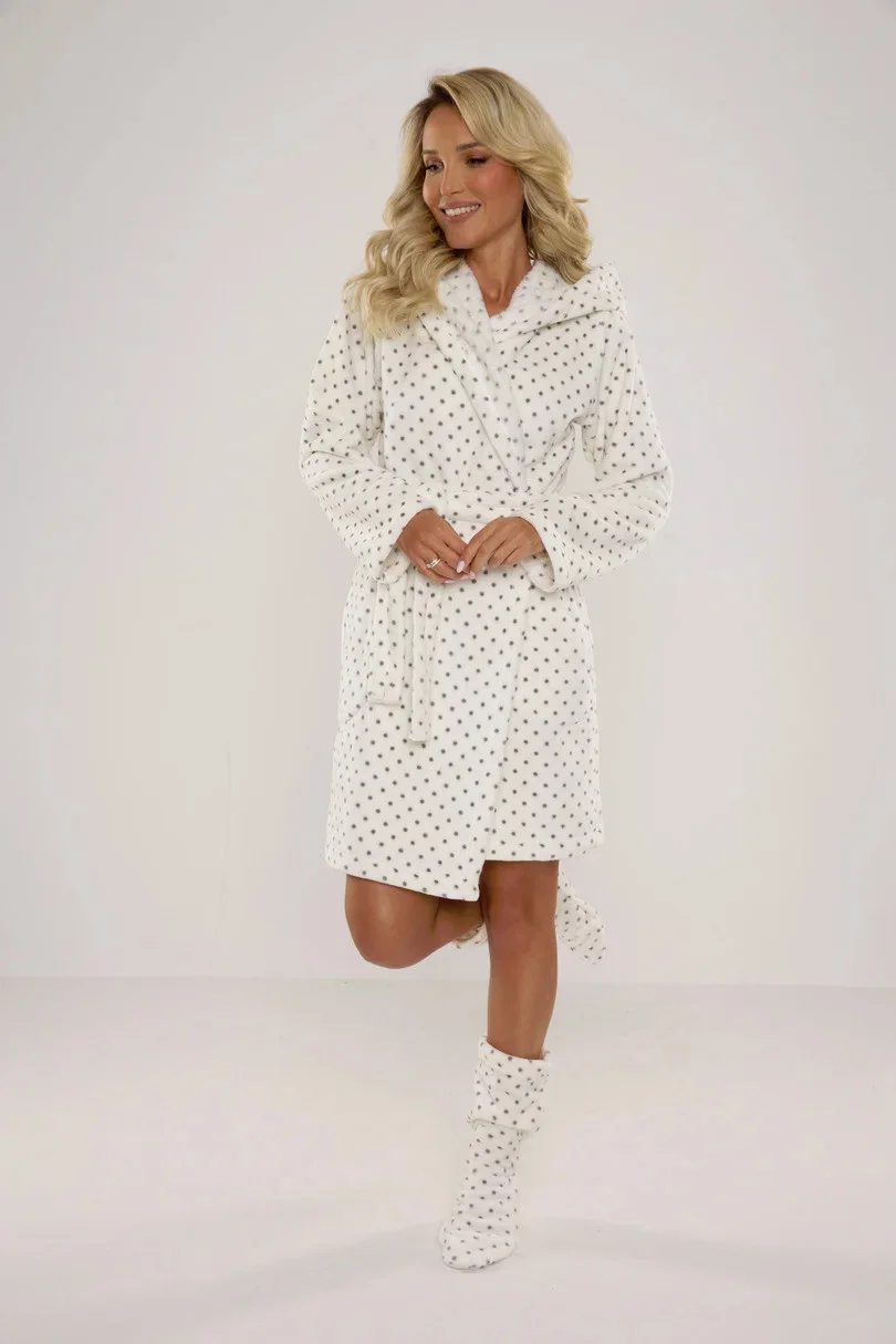 Teplý dámský puntíkovaný župan s kapucí a zavazováním v pase.