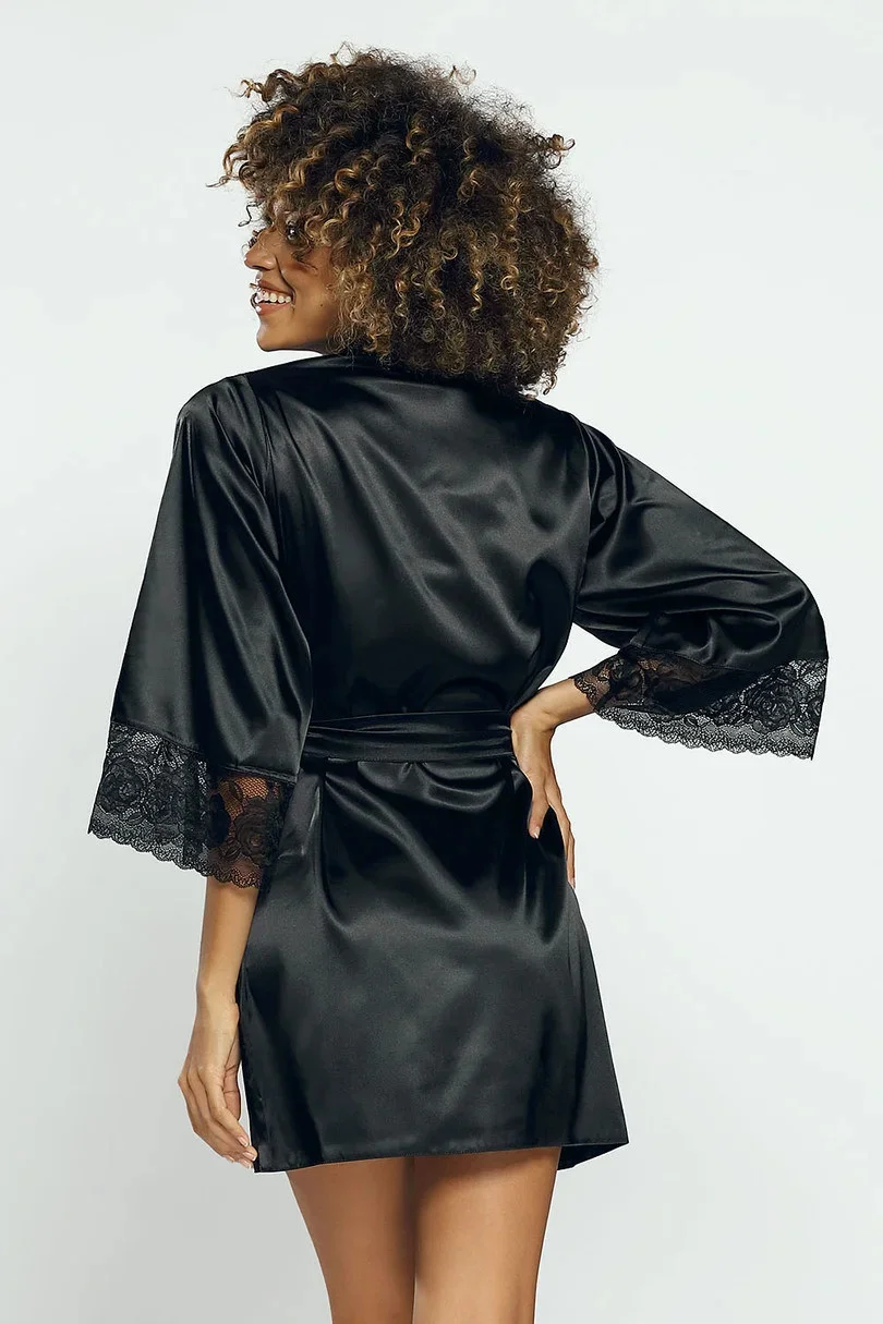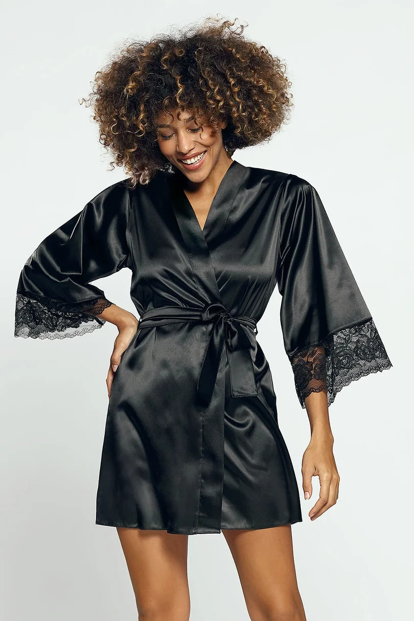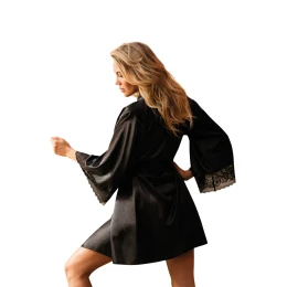 Dámský saténový župan s dlouhými rukávy. Zavazuje se saténovým páskem, který umožňuje dokonalé přizpůsobení a navíc zvýrazňuje přednosti ženské postavy.