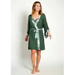 Dámský župan značky Muydemi v elegantním a lehkém provedení je ideální pro pohodlné domácí nošení i jako stylový doplněk k nočnímu prádlu. Má volnější střih s širokými rukávy typu kimono, které působí vzdušně a velmi komfortně. Župan je v tmavě zelené barvě a je doplněn kontrastními lemy s jemným přírodním motivem listů, které se opakují i na pásku pro zavazování v pase. Díky tomu působí celý model harmonicky a sofistikovaně. Příjemný a lehký materiál zajišťuje maximální pohodlí při nošení a je ideální pro relaxaci doma i příjemná rána či večery.