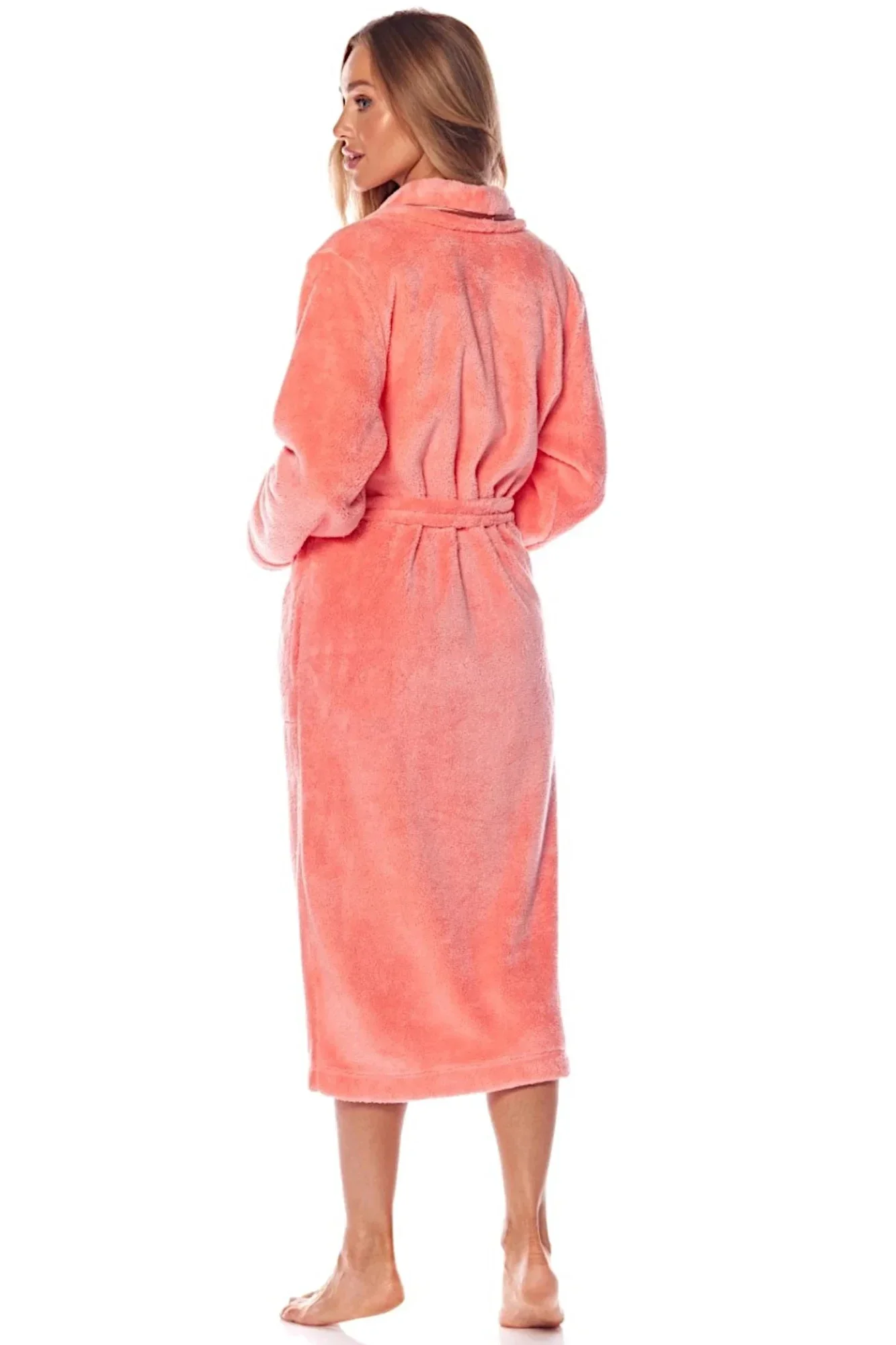 Dámský dlouhý župan 2208 Kristi L&L - velmi měkký a příjemný materiál na dotek - broskvová barva - s šálovým límcem - na bocích našité kapsy - zavazování na pásekMateriálové složení: 100% polyester