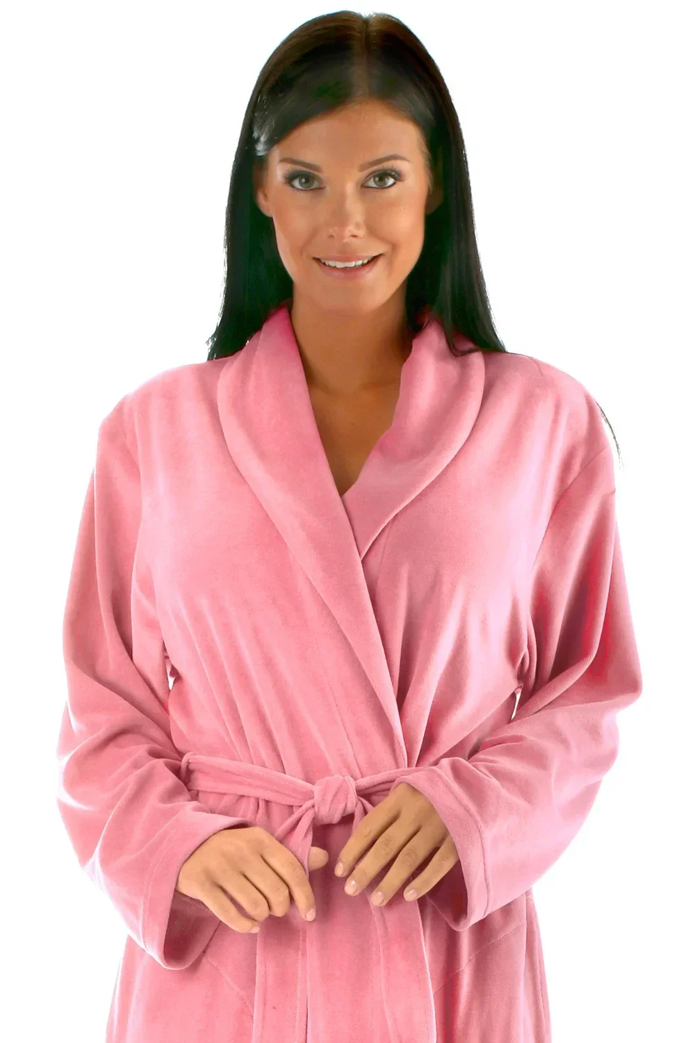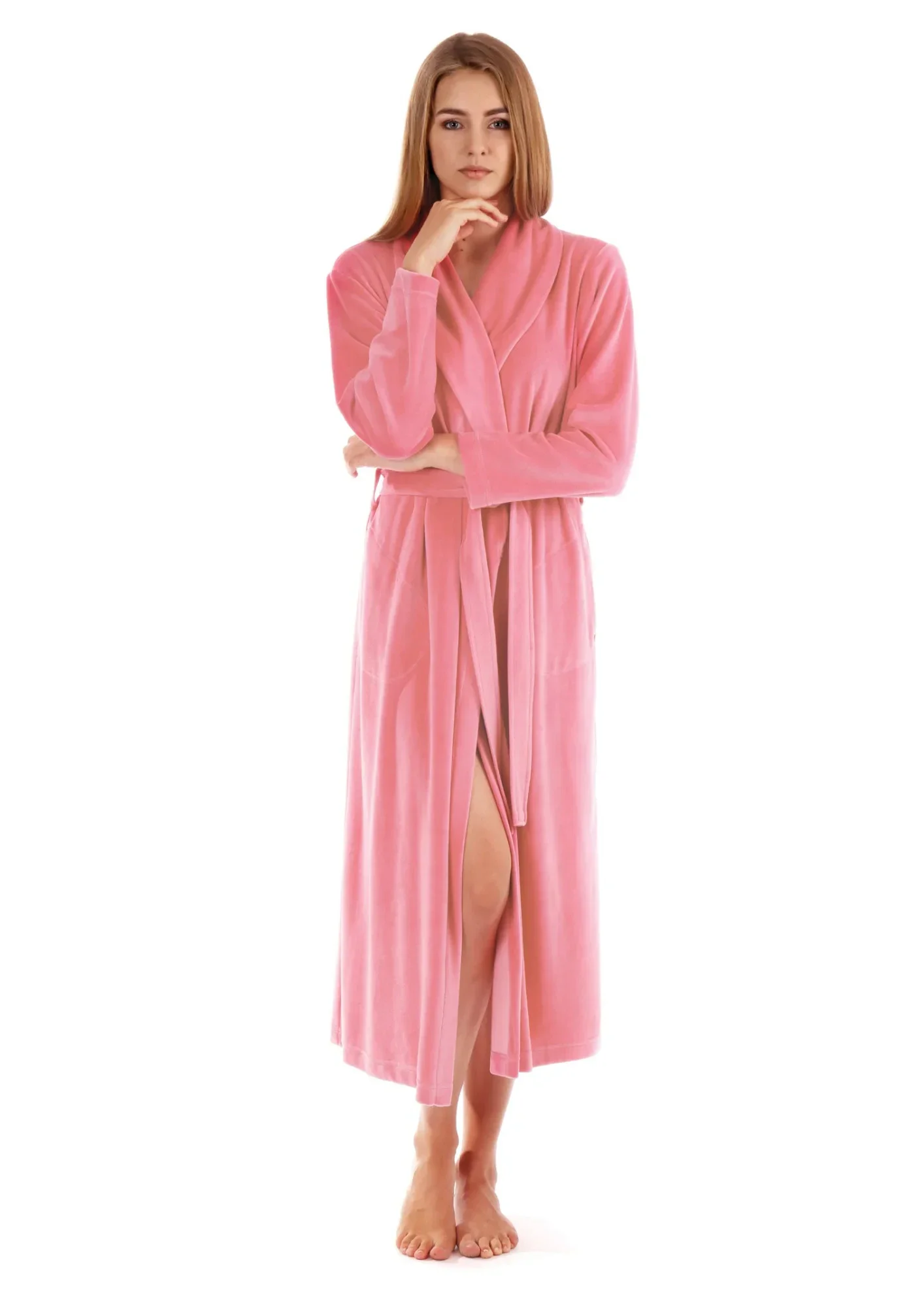 Ideální župan pro domácí relax, večerní odpočinek, ale i na cestování nebo do nemocnice. Lehký úpletový sametový velur se přizpůsobí vašim tvarům nijak neomezuje v pohybu. Župan má praktickou délku do poloviny lýtek, dvě skryté kapsy v bočních švech a pásek na převázání. Šálový límec dává županu elegantní vzhled. Tento klasický župan kombinuje maximální komfort s praktičností a nadčasovým stylem. Doplňte jej výšivkou monogramu v rámečku vystihujícím osobnost vaší dámy a získejte nádherný luxusní osobní dárek, který potěší a zároveň bude skvěle sloužit mnoho let.