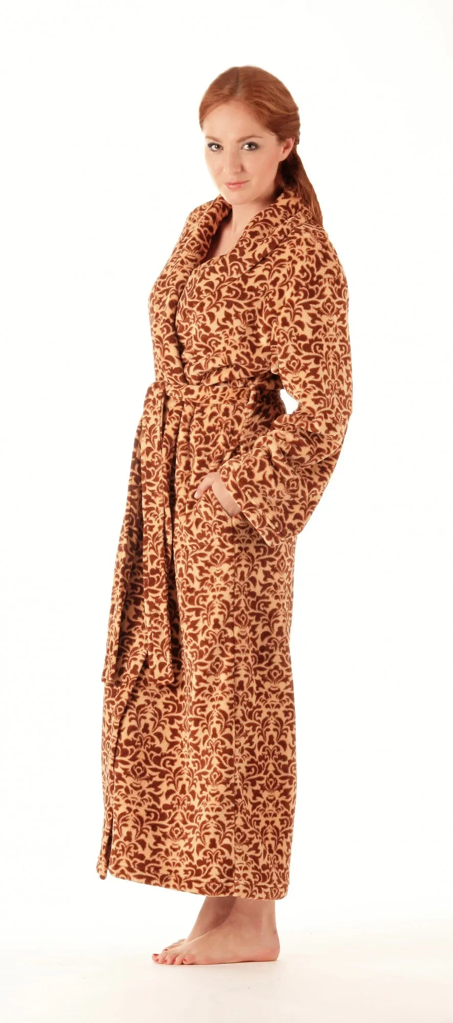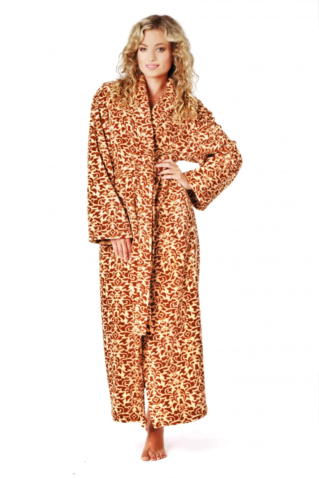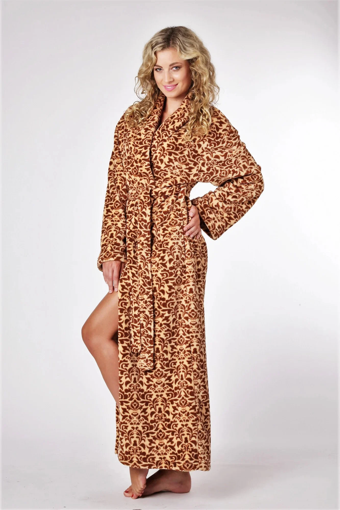 Vintage vzor v barevné kombinaci jantaru a pálené umbry nabízí na materiálu coral fleece elegantní modely kolekce Victoria. Nestárnoucí klasický střih se šálovým límcem v dlouhém provedení, postavě lichotící velmi lehce projmutý střih se zapínáním na knoflíky, nebo cenově výhodný mladistvý model ve one size velikosti v délce pod kolena s kapucí. Materiál Coral fleece je lehký, hřejivý, má krátký vlas, je příjemný na dotyk a snadno se udržuje. Na objednávku vyrábíme i v nadměrných velikostech