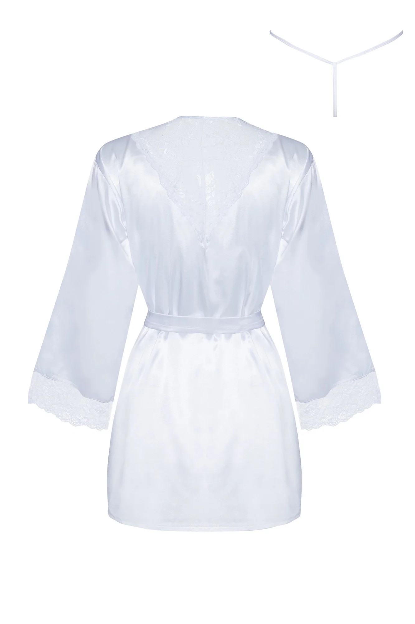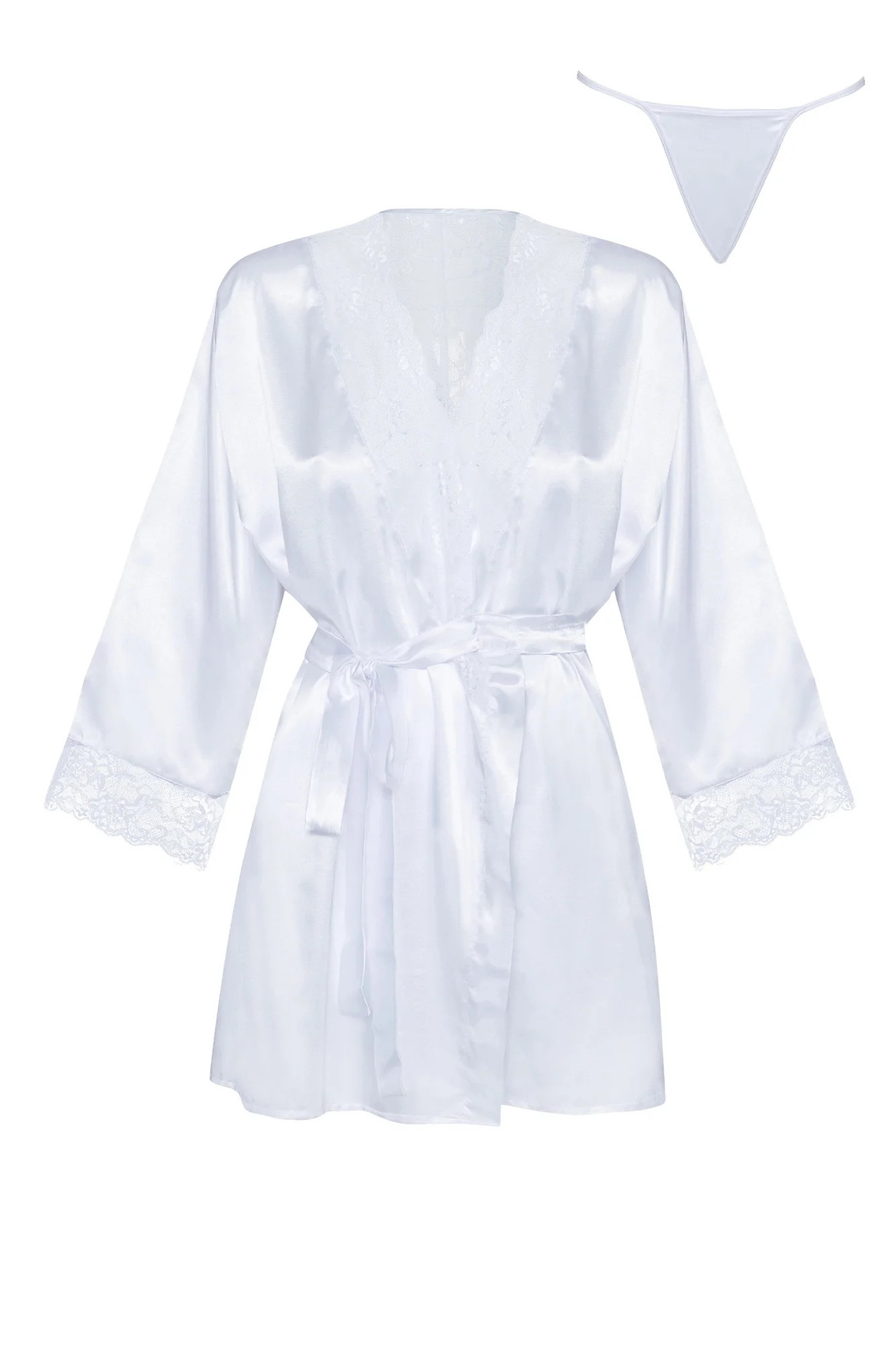 Dámský župan Fabienne black BEAUTY NIGHT FASHION - černá barva - z jemného saténu - zdobený smyslnou průsvitnou květinovou krajkou - dlouhé široké rukávy zakončené krajkou - průsvitná krajková tanga jsou součástí balení - zboží je zabalené v dárkovém pytlíčku, který je ideální pro skladování i na praní