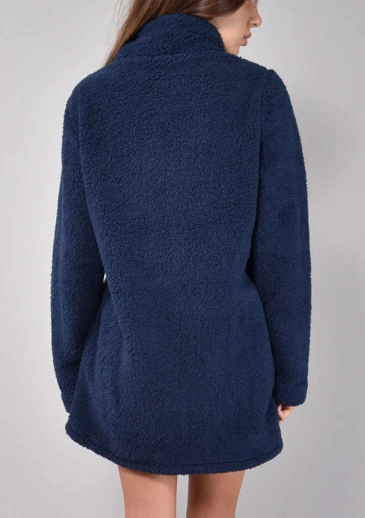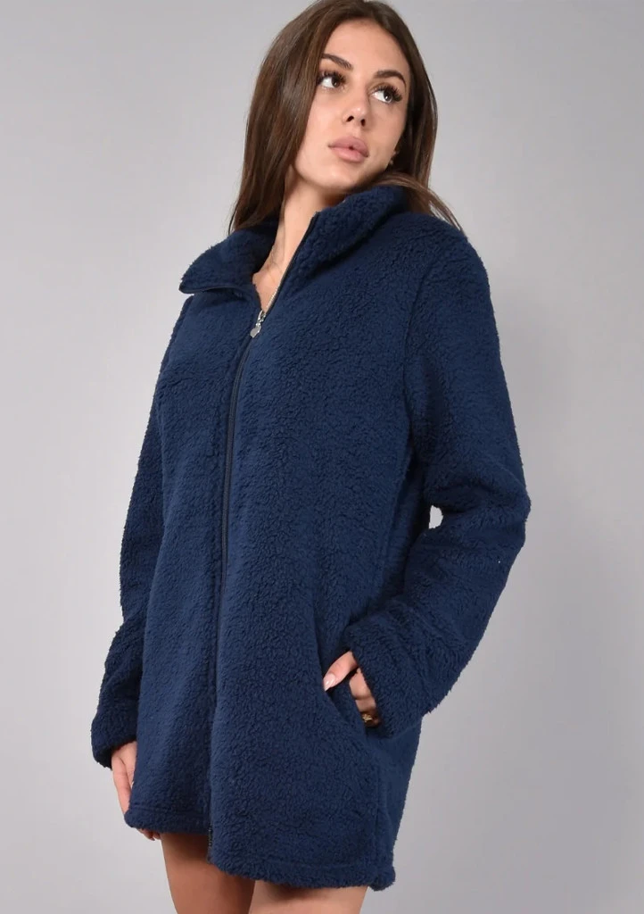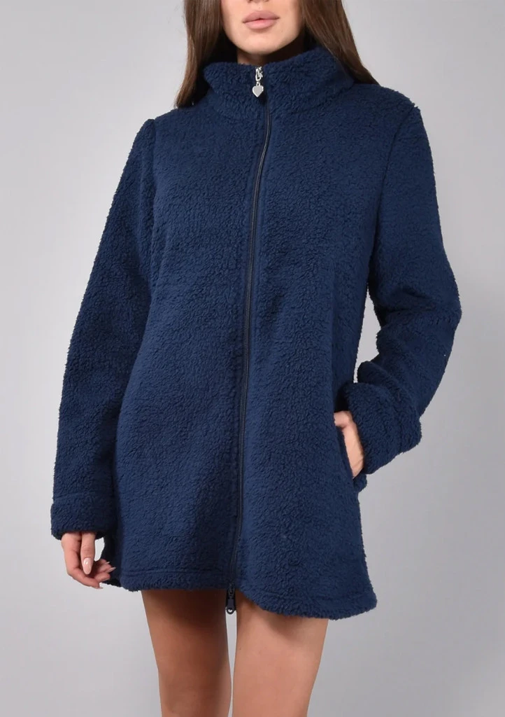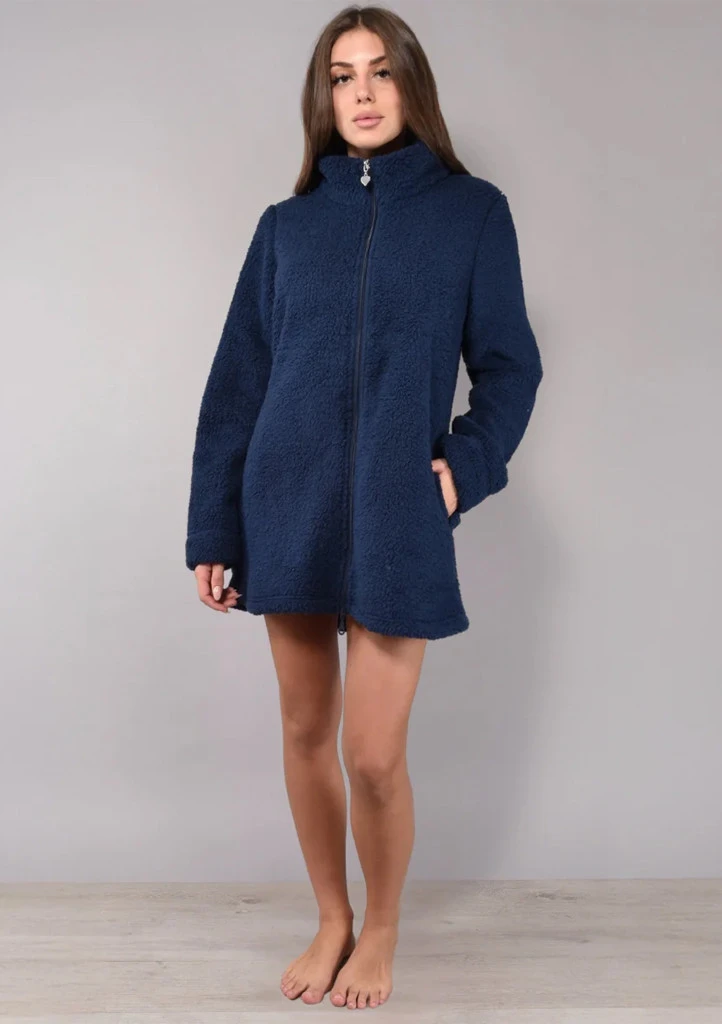 Tento dámský župan Siélei v elegantní tmavě modré barvě je ideální volbou pro příjemné domácí pohodlí. Je vyrobený z měkkého a hřejivého „teddy“ materiálu, který připomíná jemný beránek a spolehlivě zahřeje i v chladnějších dnech. Župan má moderní střih se zapínáním na zip po celé délce a praktické postranní kapsy. Vysoký stojáček chrání před chladem a dodává celému modelu stylový vzhled. Díky delší délce skvěle obepíná postavu a poskytuje maximální komfort. Perfektní volba pro ty, kdo mají rádi hebké, měkoučké a opravdu hřejivé materiály.