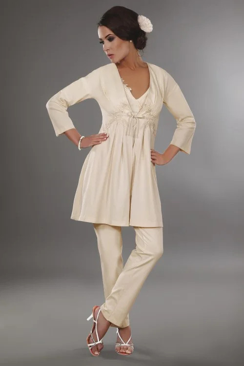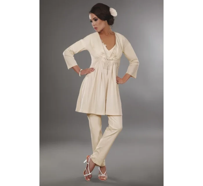 Pohodlný bavlněný župan světlé barvy s výšivkou v oblasti prsou. Univerzální, ideální pro každé roční období, měkký a elegantní, střih a'la kimono, volný a splývavý lem, rukávy ve 3/4 délce, zavazování vpředu. 95 % bavlna, 5 % elastan.