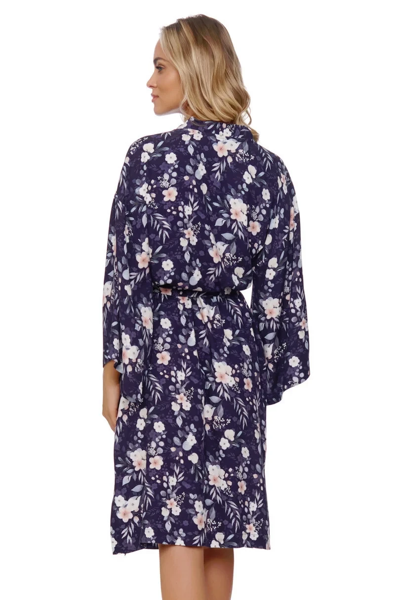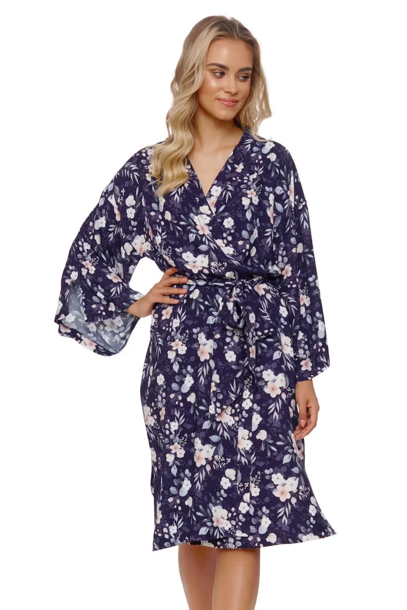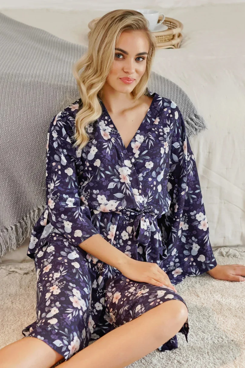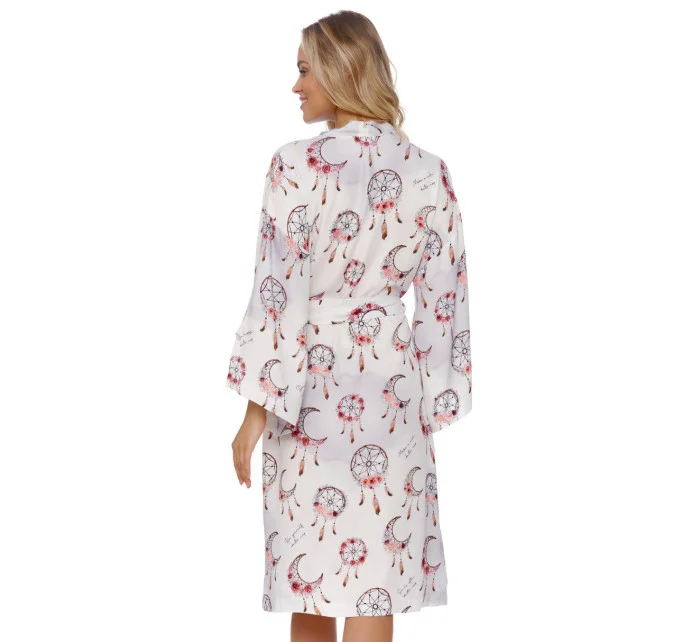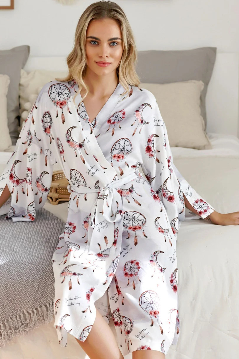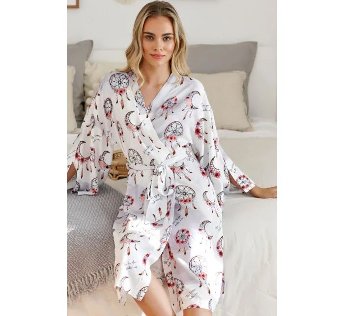 Bambusový župan s krásným vzorem uvázaný v pase. Ve stylu HOMEWEAR, ideální při relaxaci jako pohodlné domácí oblečení, na pláž, na letní večery, vyrobené z bambusové viskózy nejvyšší kvality. Nádherný ženský střih s páskem v pase a jemnými rozparky na rukávech.