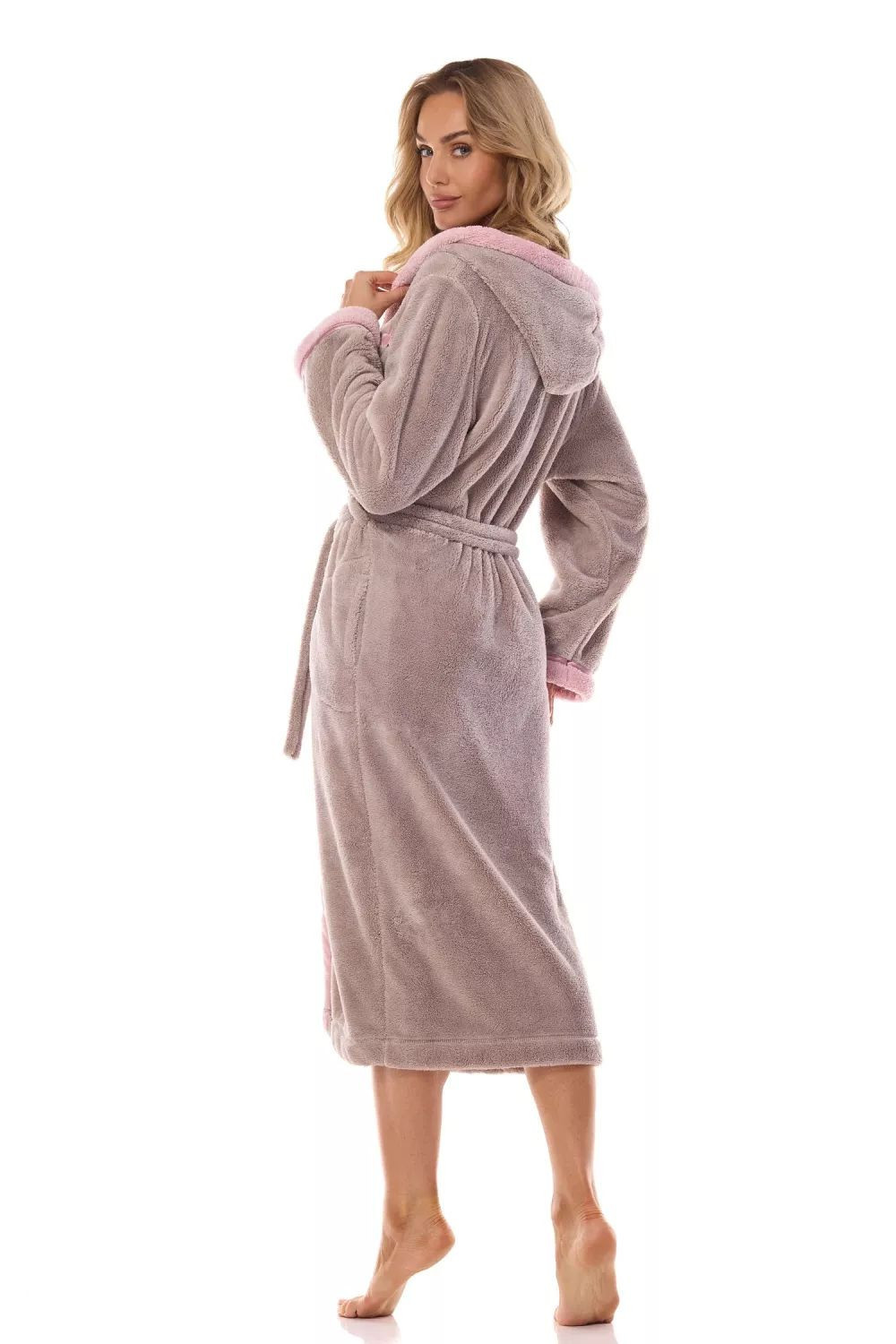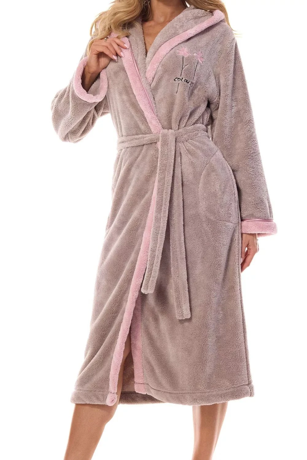 Dámský župan 2419 Tess opal L&L - béžová barva - z měkkého materiálu typu soft - na prsou ozdobná výšivka - kapsy a v pase vázání na pásek - kontrastní lemování - s kapucí - dlouhý