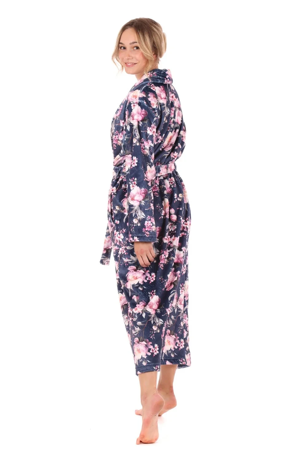 Elegantní dámský župan s romantickým květinovým vzorem kde jemné růžové tóny příjemně kontrastují s barvou temné noční oblohy.