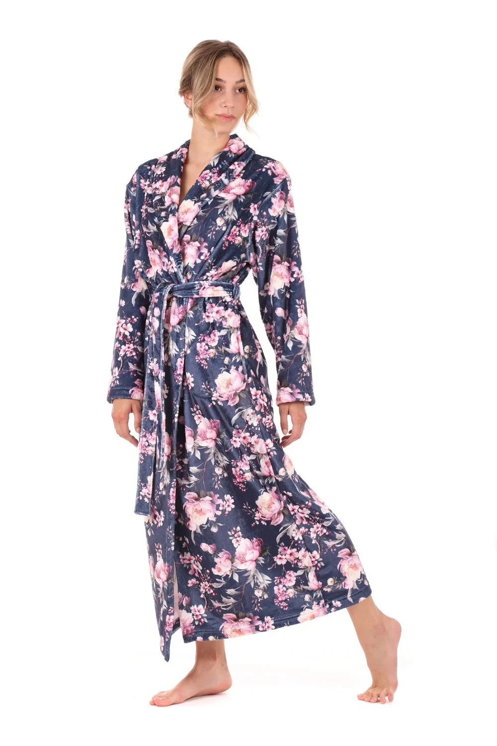 Elegantní dámský župan s romantickým květinovým vzorem kde jemné růžové tóny příjemně kontrastují s barvou temné noční oblohy.