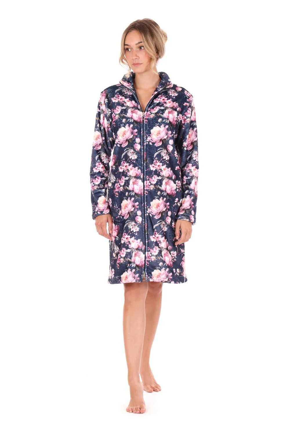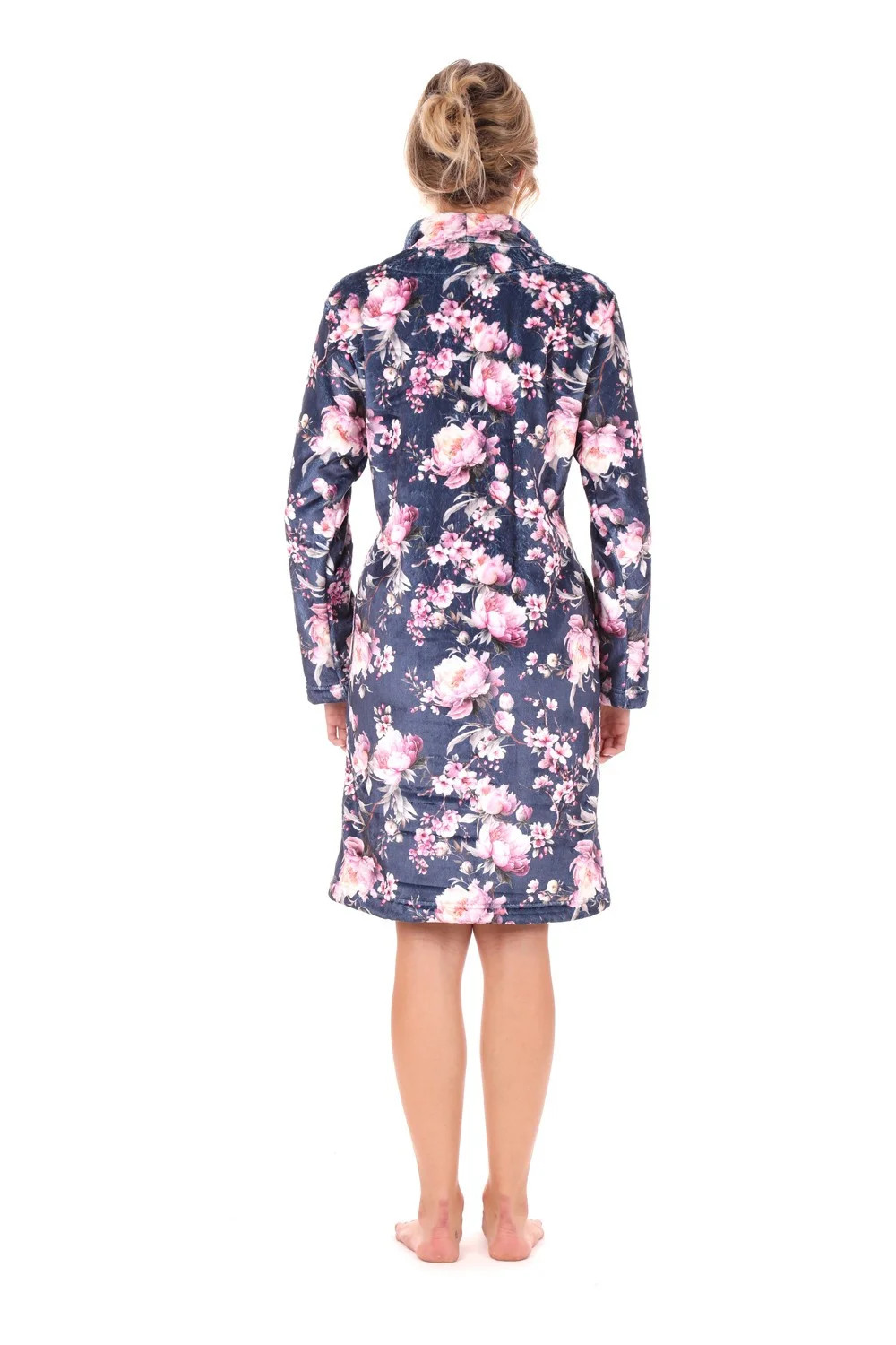 Elegantní dámský župan s romantickým květinovým vzorem kde jemné růžové tóny příjemně kontrastují s barvou temné noční oblohy.