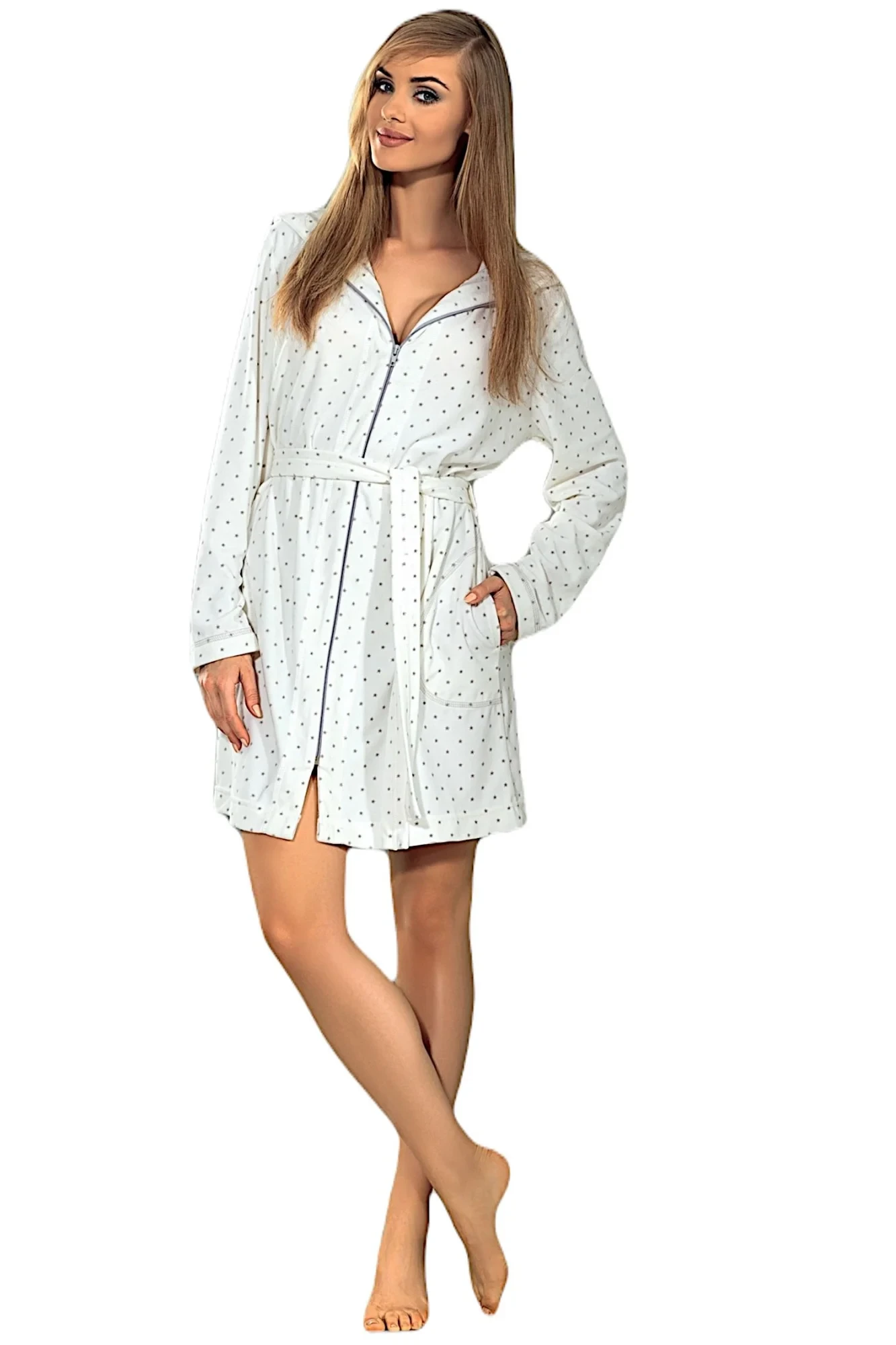 Dámský župan Zappa white L&L - bílá barva - z bambusového vlákna - hebký materiál se vzorem drobných hvězdiček - má krásný sametový vzhled - zapínání na zip - zavazování v pase na pásek - s kapucí