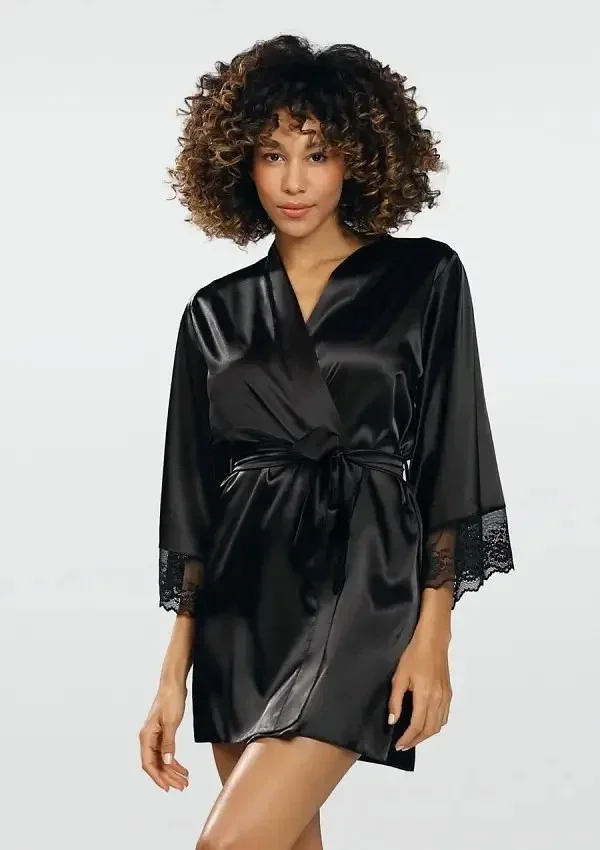Elegantní dámský župánek, který je vyrobený z lesklého saténu.