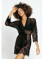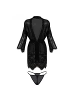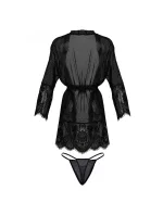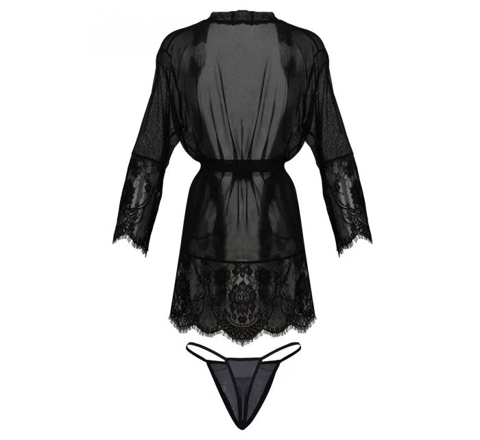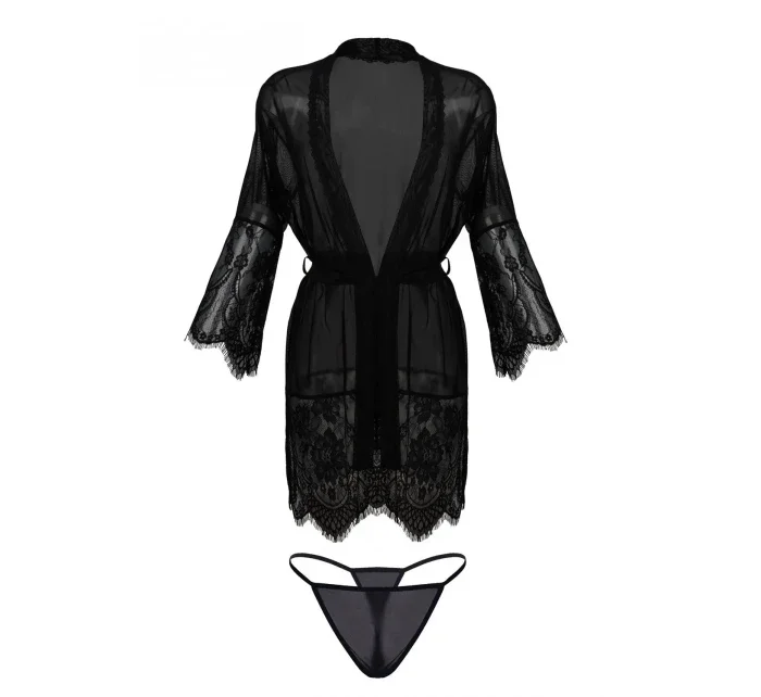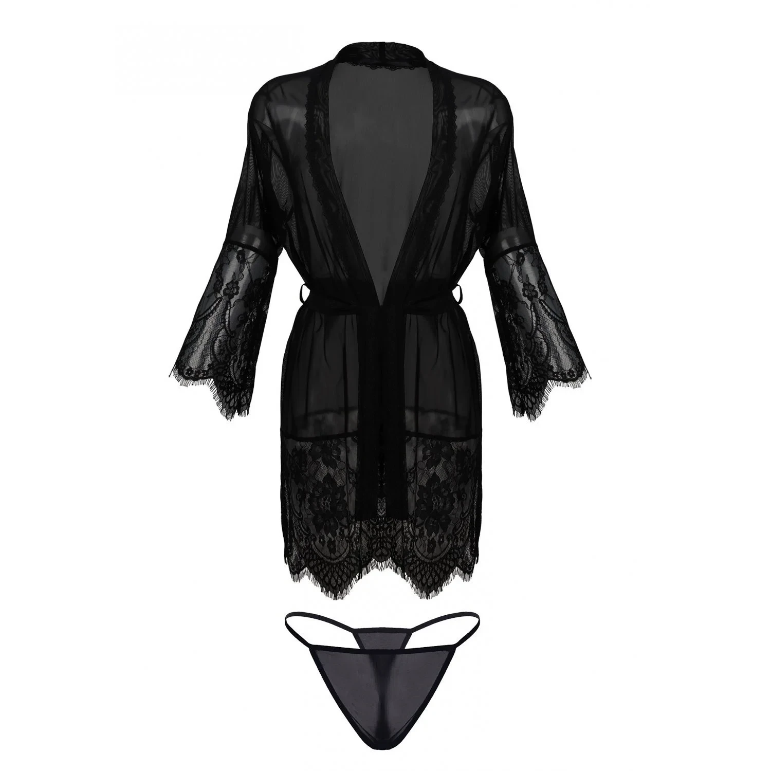 Župánek je vyrobený z tylové síťoviny a z efektní krajky s květinovým motivem. Model se v pase zavazuje. Komplet doplňují kalhotky string (tanga) z jemné síťoviny.