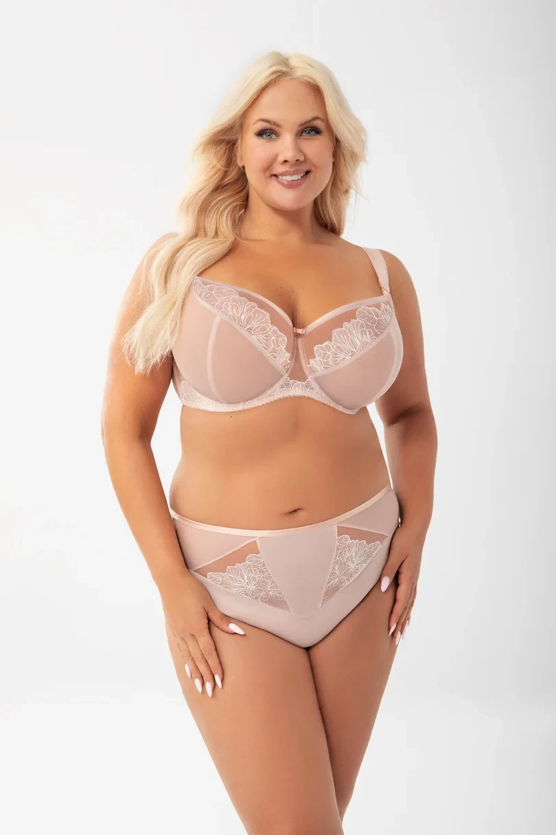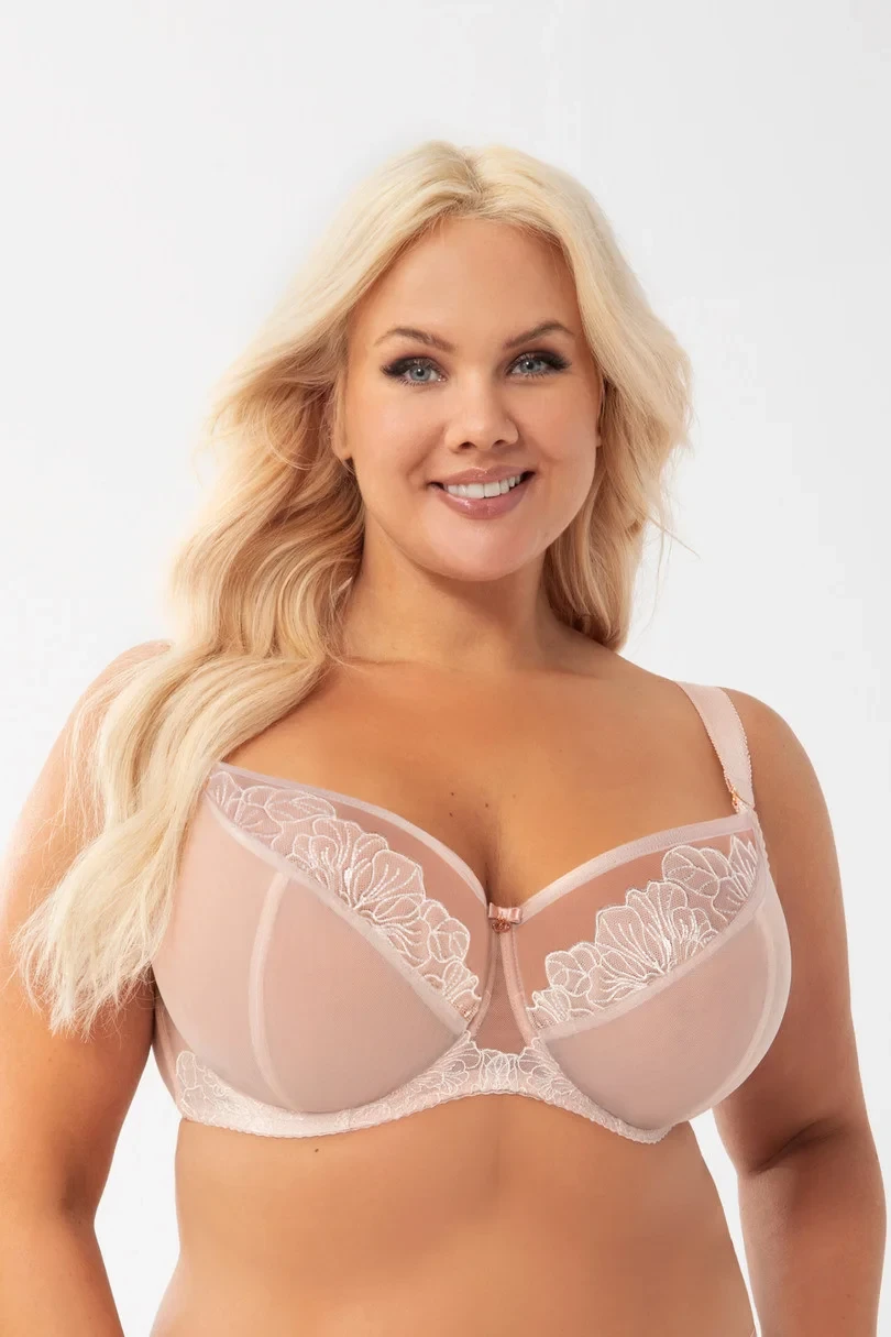 Biustonosz miękki przeznaczony dla kobiet ze średnim, dużym i bardzo dużym biustem. Zapewnia efekt mocnego uniesienia i zebrania biustu do środka, 3-częściowe miski wykonane z tiulu stabilnego oraz haftu. Górna krawędź miski wykończona połyskującą taśmą, płynnie przechodzi do ramiączka powodując lepsze podtrzymanie biustu. Tył z transparentnej lycry zapewniającej bardzo dobre dopasowanie i podtrzymanie. Fiszbiny boczne zapobiegające zwijaniu się materiału. W zależności od rozmiaru dwu lub trzyrzędowa haftka z trójstopniową regulacją obwodu. Nieodpinane, regulowane ramiączka w trzech szerokościach, w większych rozmiarach dodatkowo wzmocnione welurową taśmą. Metalowe elementy w kolorze różowego złota (nie zawierają niklu)