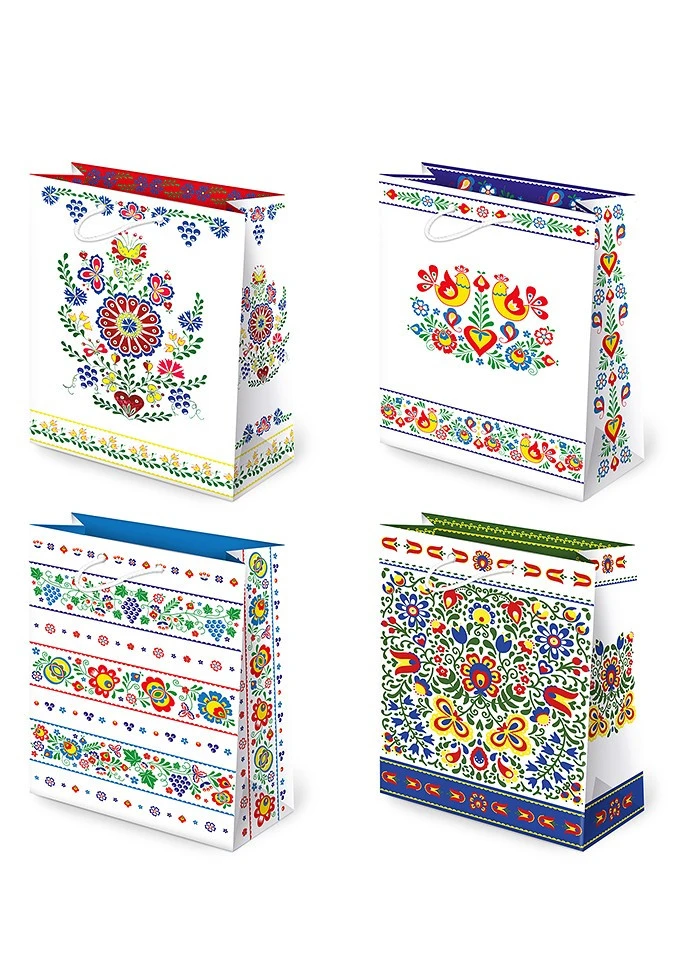 Laminované papírové dárkové tašky. Balení po 10 kusech. V balení po 4 vzorech.EAN čárové kódy zboží jsou: