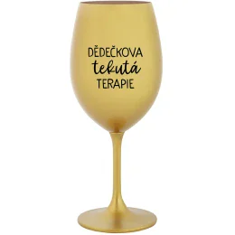 Vinná zlatá sklenice s originálním motivem DĚDEČKOVA TEKUTÁ TERAPIE je krásným a osobitým dárkem, které ale využijete i Vy sami třeba ve chvílích, kdy si budete chtít zpříjemnit náročný den. Tyto originální vinné sklenice jsou totiž nejen pro výjimečné události, ale i pro běžné večery, které si chcete zpříjemnit sklenkou dobrého vína. Jistě proto potěší každého milovníka vína, i toho, kdo si umí svůj život vychutnat plnými doušky.