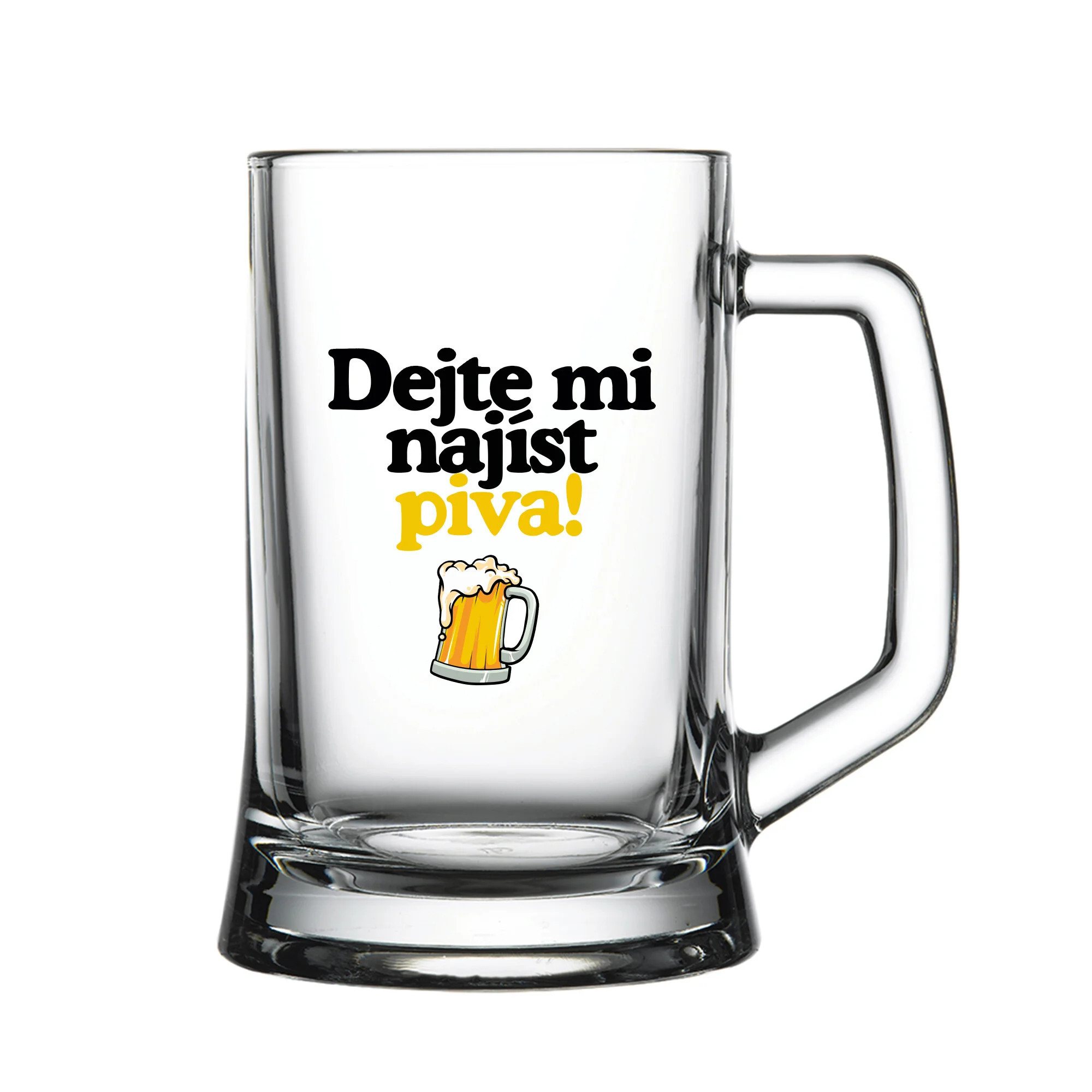 Hledáte dokonalý dárek pro milovníky piva? Naše pivní sklenice jsou přesně to, co potřebujete! Každá sklenice je vyrobena z prvotřídního skla, které zaručuje dlouhodobou odolnost a čistotu. S objemem 0,5 litru jsou tyto sklenice ideální pro vychutnávání oblíbeného zlatavého moku. Ale to nejlepší na nich je jedinečný vtipný nápis: DEJTE MI NAJÍST PIVA!, který osloví každého pivaře. Ať už jde o pohodový večer s přáteli nebo relaxační chvíle u oblíbeného seriálu, tyto sklenice dodají každé příležitosti špetku humoru. Nenechte si ujít příležitost udělat radost sobě nebo svým blízkým tímto vtipným a praktickým dárkem. Objednejte si nyní a užívejte si pivo s úsměvem! Doporučujeme ruční mytí tohoto produktu pro zachování jeho kvality a trvanlivosti. Nedoporučujeme umisťovat do myčky na nádobí.