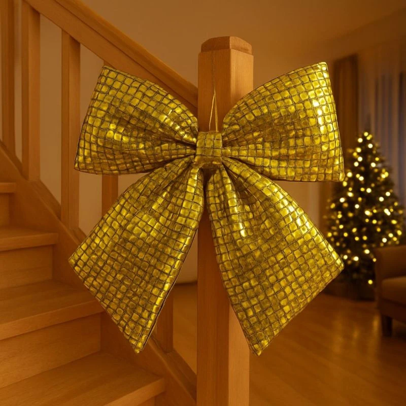 Złoty, lustrzany kolor odbija światło, co sprawia, że kokarda rozświetla wnętrze i dodaje mu eleganckiego charakteru. Idealnie komponuje się ze światłem lampek choinkowych.