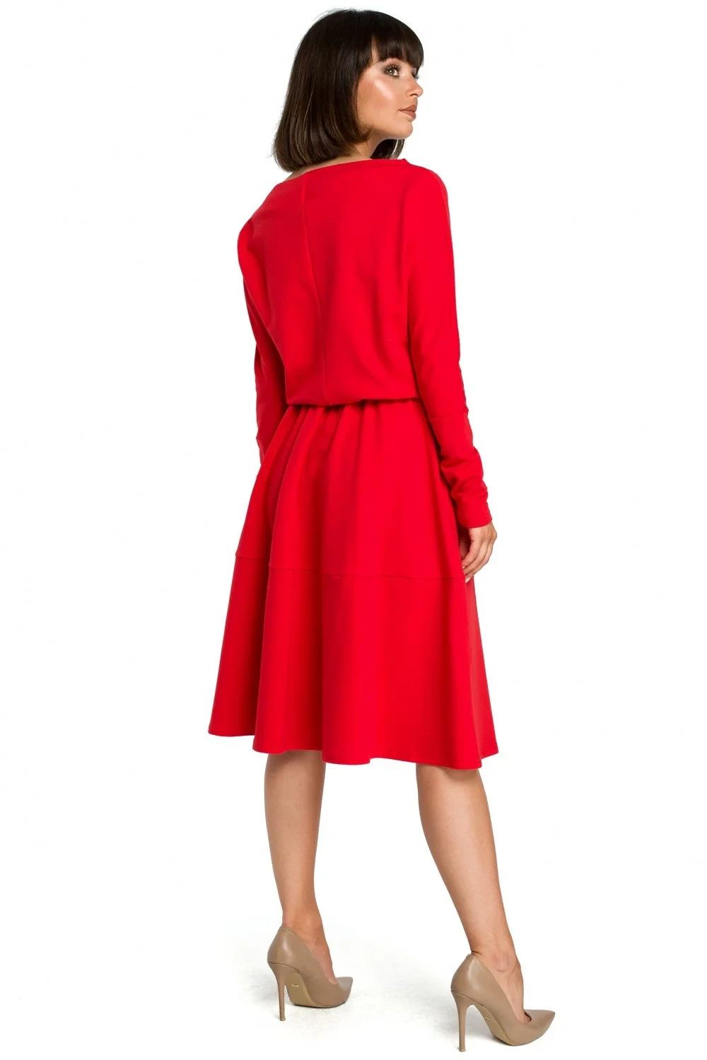 Má rozšířenou spodní část a mírně vypasovaný horní díl s dlouhými rukávy a vodopádovým výstřihem. Šaty pro každou postavu. Má pružný pas, délku pod kolena a kapsy na bocích.