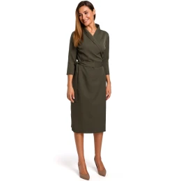 Šaty s obálkovým výstřihem a šálovým límcem, ženské a elegantní. Střih zdůrazněný úzkým páskem zeštíhluje postavu. Šaty bez podšívky.