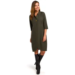 Elegantní šaty se střihem saka. Jedinečný střih se skrytým záhybem zapínaným vpředu na miniaturní patentky a vzadu na gumu. Vysoký límec, nárameníky a decentní knoflíky v jantarové barvě dodávají šatům noblesu. Šaty jsou bez podšívky.