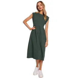 Pletené šaty v délce midi. Střih s vysokým pasem a volnou sukní opticky zužuje pas a díky rovnému střihu navíc zeštíhluje celou siluetu. Má charakteristické, velmi krátké rukávy a vestavěný výstřih. Šaty jsou ideální pro každodenní nošení i jako společenské šaty.