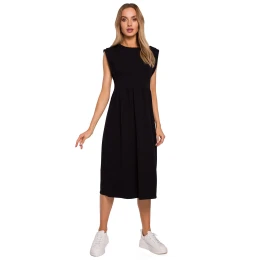 Pletené šaty v délce midi. Střih s vysokým pasem a volnou sukní opticky zužuje pas a díky rovnému střihu navíc zeštíhluje celou siluetu. Má charakteristické, velmi krátké rukávy a vestavěný výstřih. Šaty jsou ideální pro každodenní nošení i jako společenské šaty.