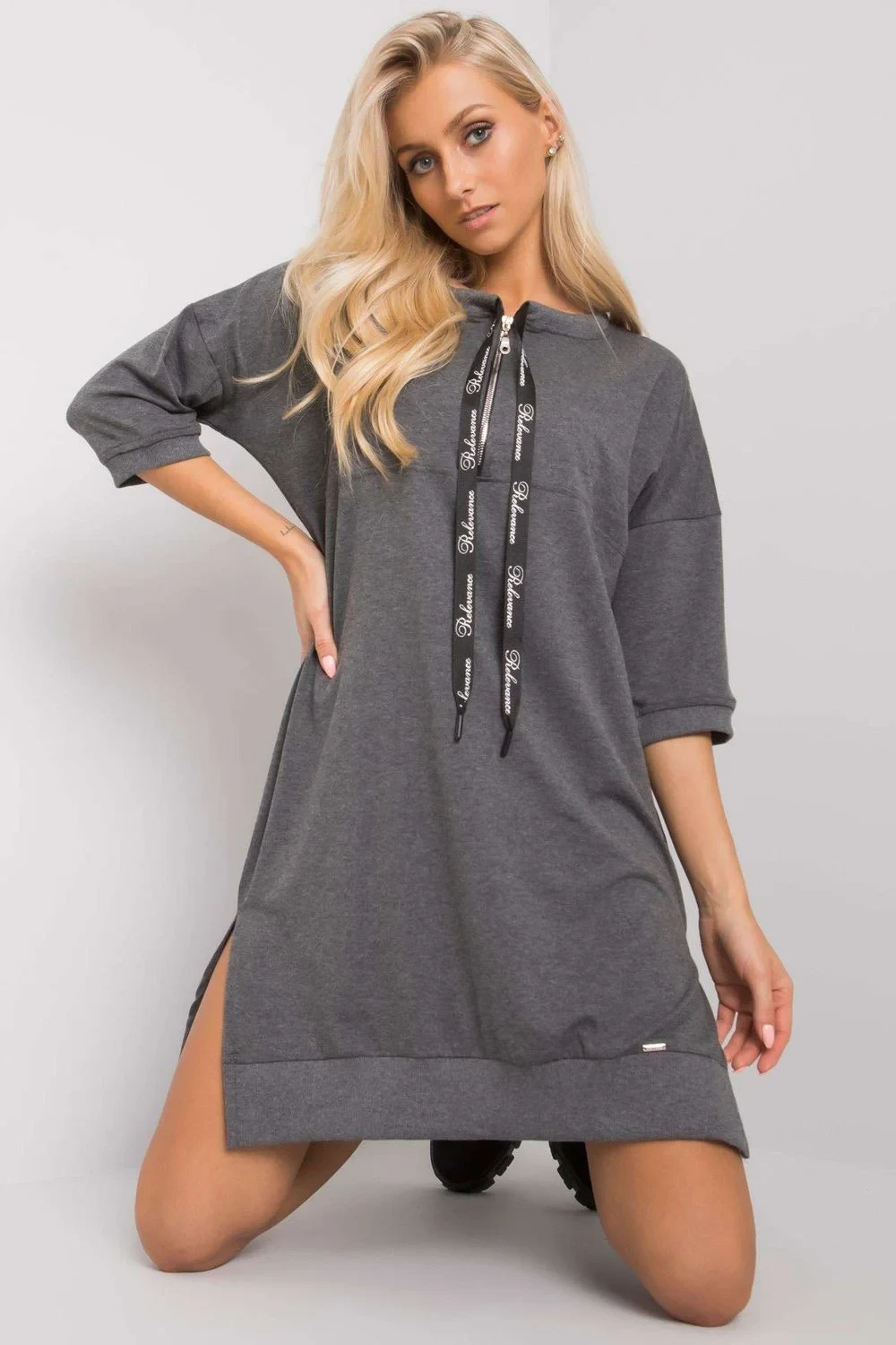 Tmavě šedé bavlněné šaty se zapínáním na zip. Šaty s 3/4 rukávy a rozparky ve spodní části.