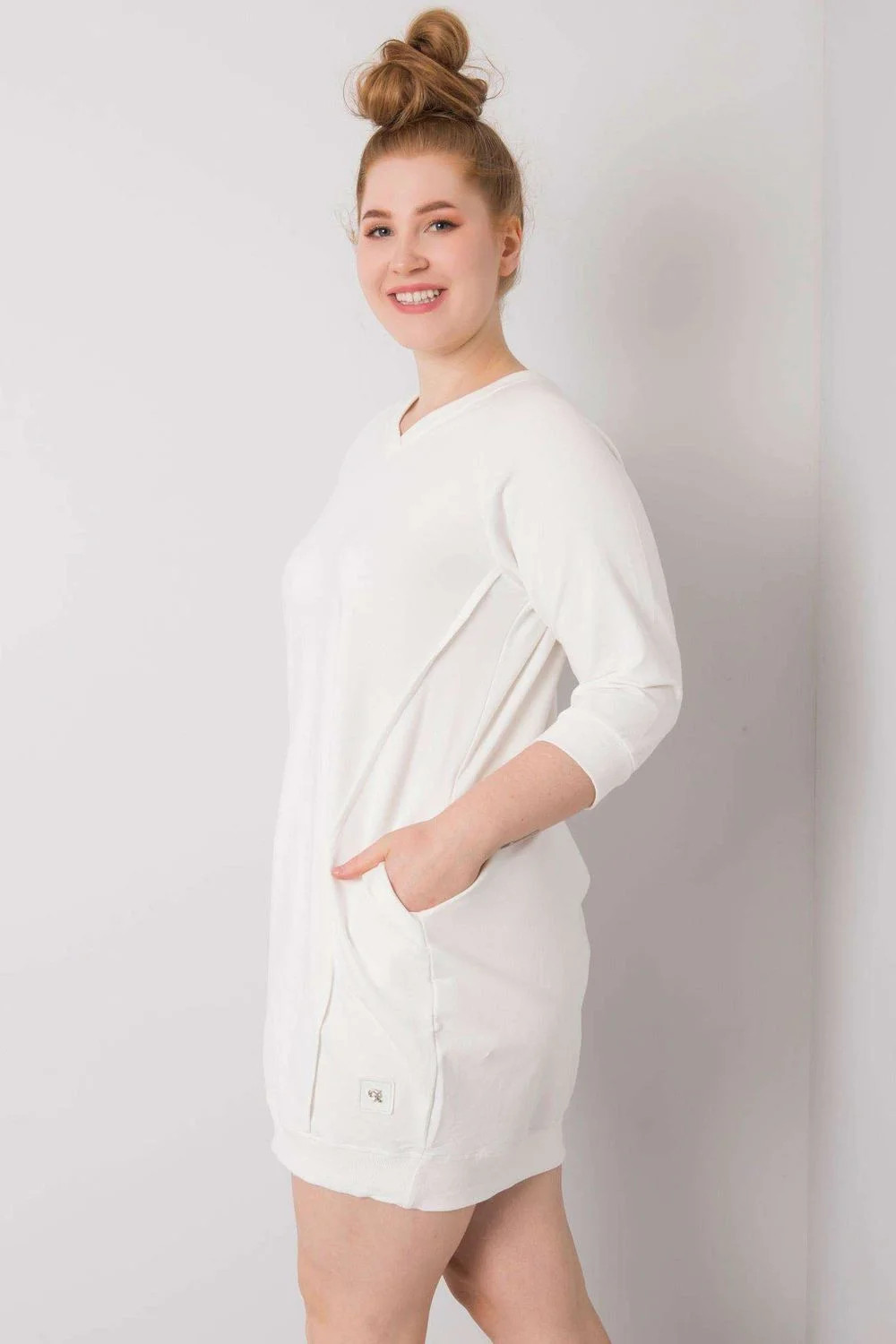 Nadměrné šaty s kapsami a 3/4 rukávy v barvě ecru.