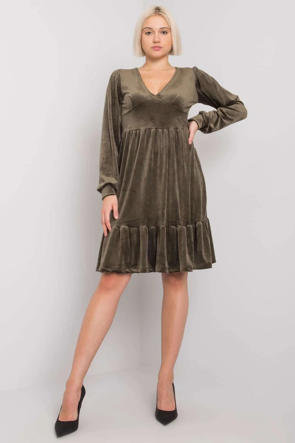 Velurové šaty s dlouhými rukávy a volánem ve spodní části. Perfektní nabídka pro mnoho příležitostí.
