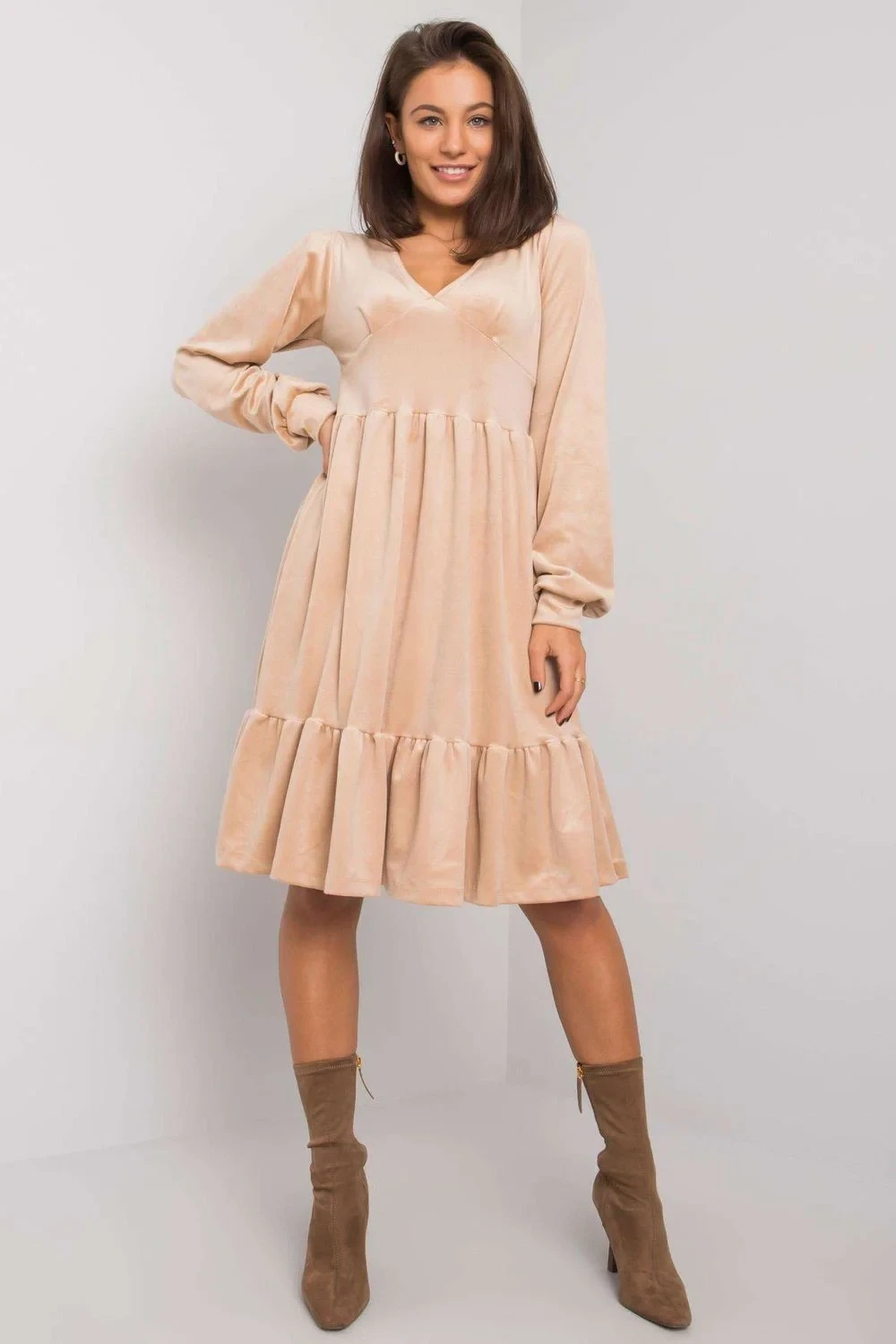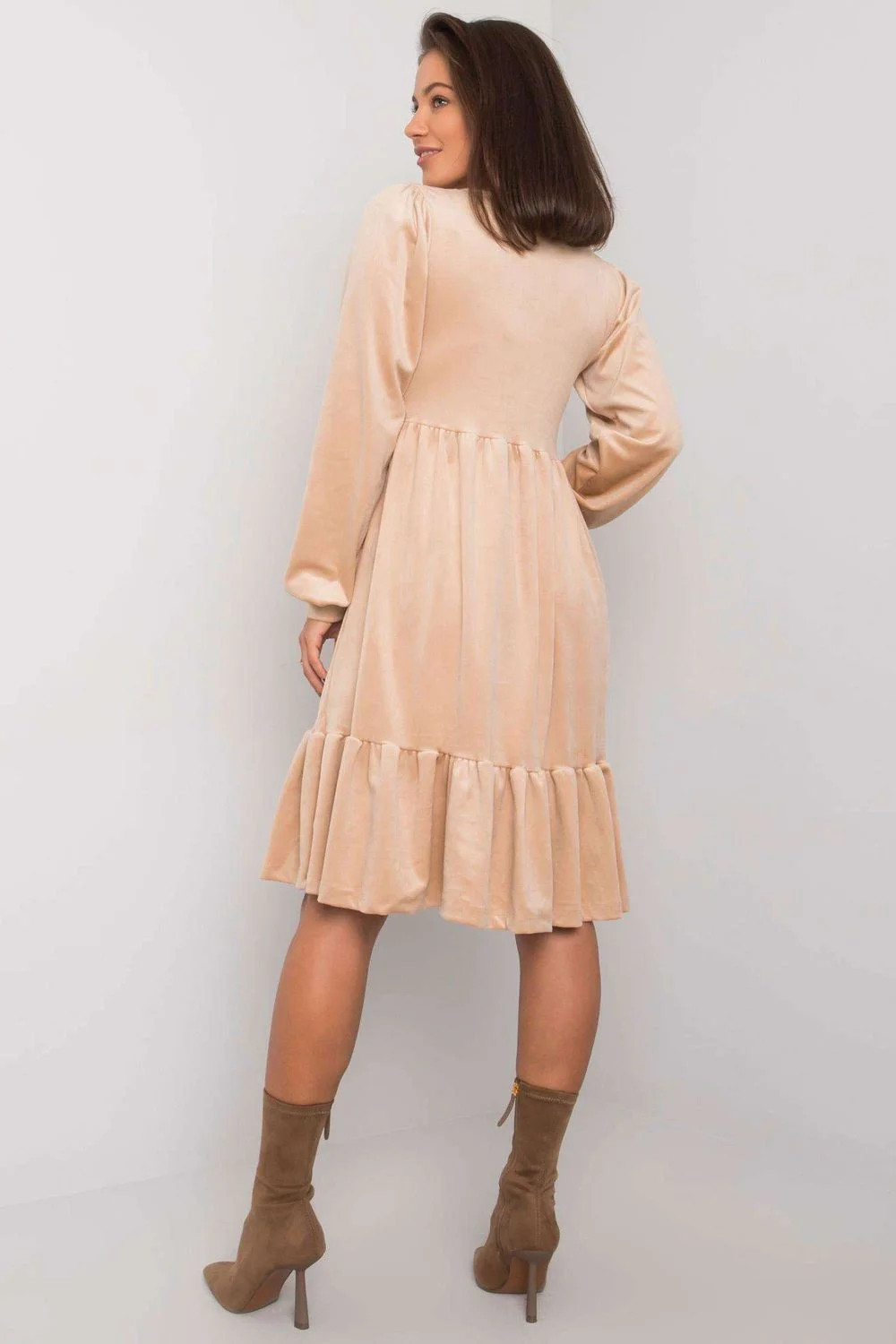 Velurové šaty s dlouhými rukávy a volánem ve spodní části. Perfektní nabídka pro mnoho příležitostí.
