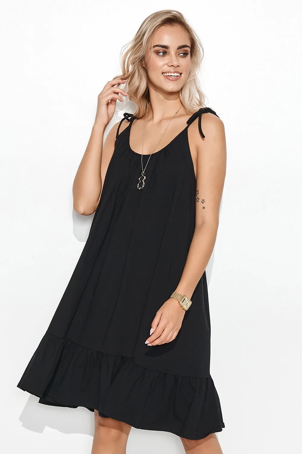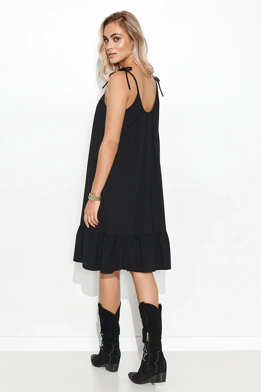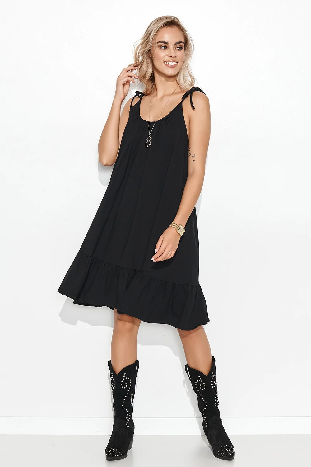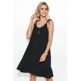 Letní šaty z teplákového úpletu příjemného na dotek. Šaty mají tenká ramínka zakončená romantickým zavazováním. Dívčí styl šatů doplňuje volánek všitý do jejich spodní části. Šaty jsou velmi pohodlné a ležérní. Lze je nosit volně, svázané páskem, řemínky nebo letním šátkem. Oblečte si ji k módním kovbojským botám nebo oblíbeným sportovním botám. V každém případě budou šaty vypadat skvěle. Noste ho tak, jak se vám líbí a jak se cítíte. Móda je přece o sebevyjádření.