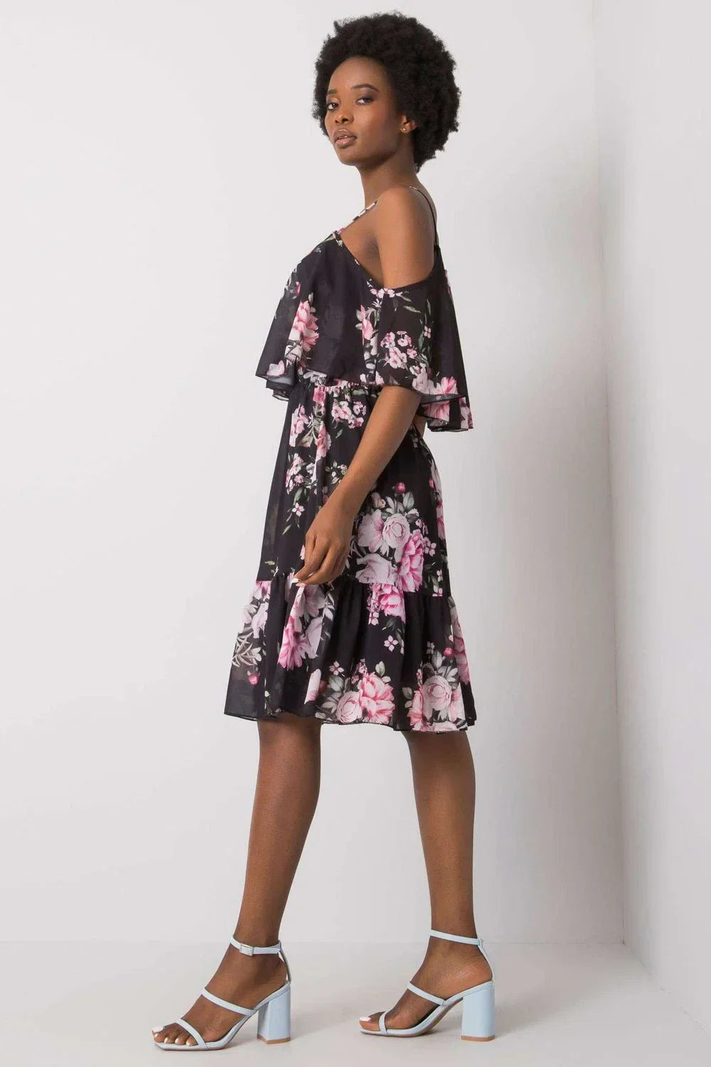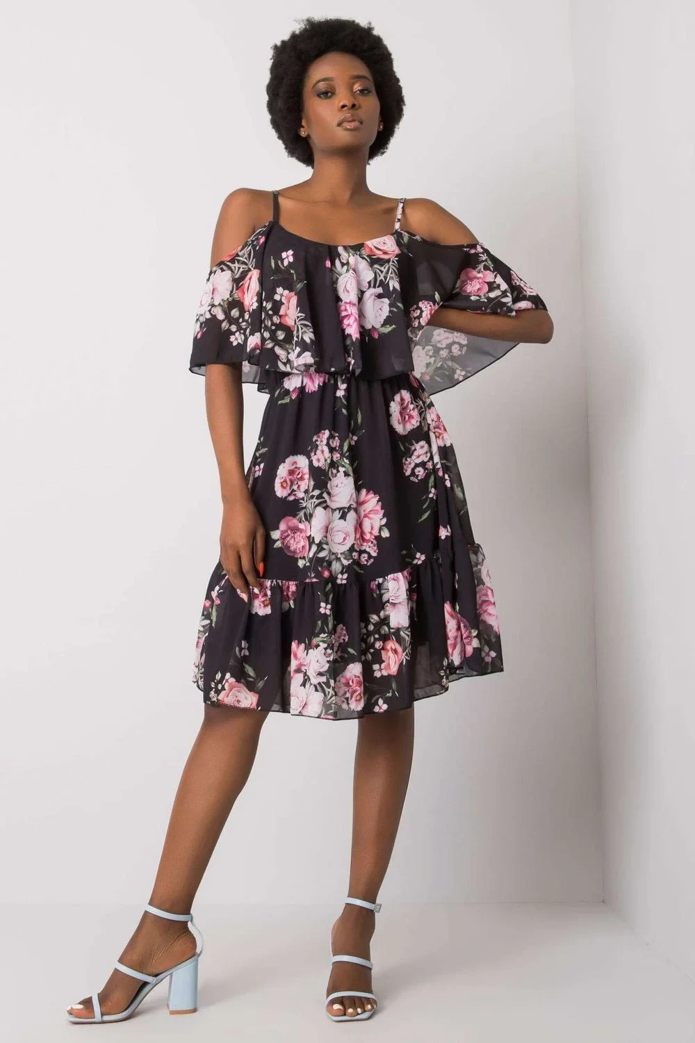 Šaty z květinové látky, na ramínka s krátkými rukávy. Šaty rozšířeného střihu s volánem. Ideální pro mnoho příležitostí.