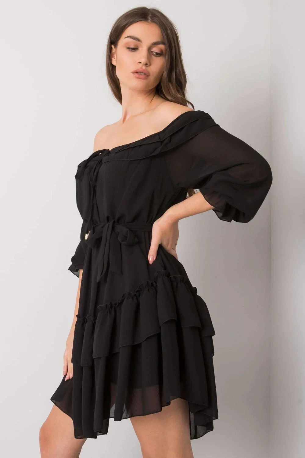 Šaty ve španělském stylu s 3/4 rukávy. Šaty s ozdobnými volánky, zavazováním v pase a ve výstřihu. Ideální pro mnoho příležitostí.