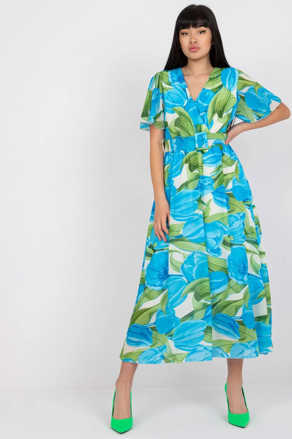 Letní šaty s krátkými rukávy v podobě volánků. Šaty s podšívkou. Obálkový výstřih, pásek v pase, rozšířená spodní část. Ideální pro mnoho příležitostí.