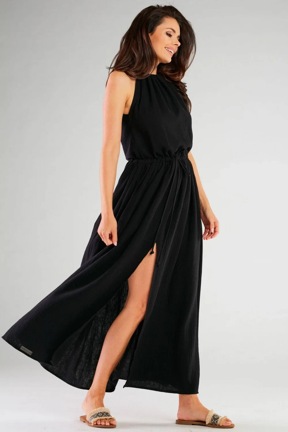 Šaty se smyslnými bočními rozparky. Ideální pro městský a prázdninový styling. Navrženo a ušito v Polsku.
