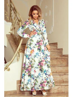 Dlouhé šaty s krátkými rukávy ve tvaru volánu. Zavazování v pase, plisovaná spodní část šatů. Perfektní letní nabídka.