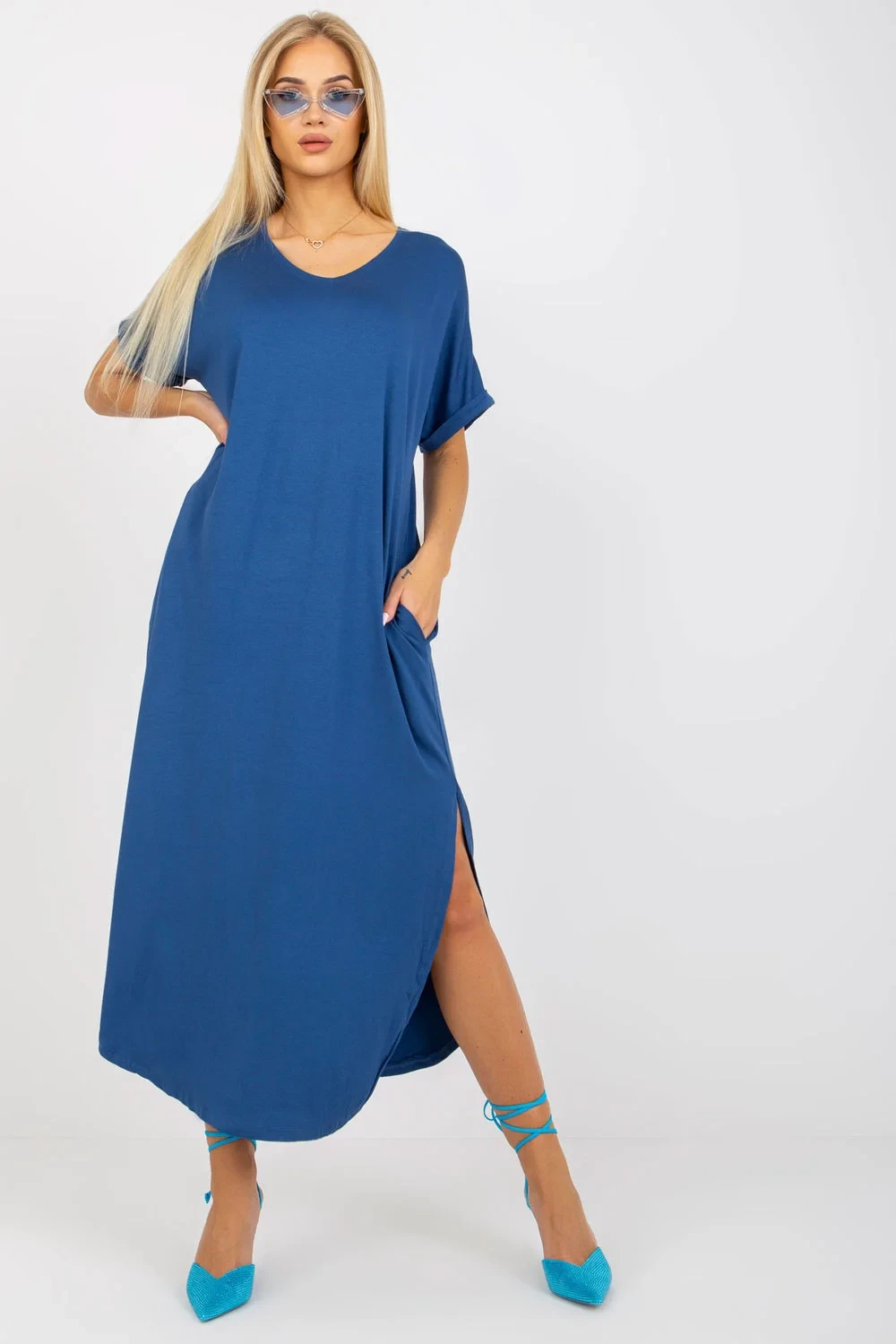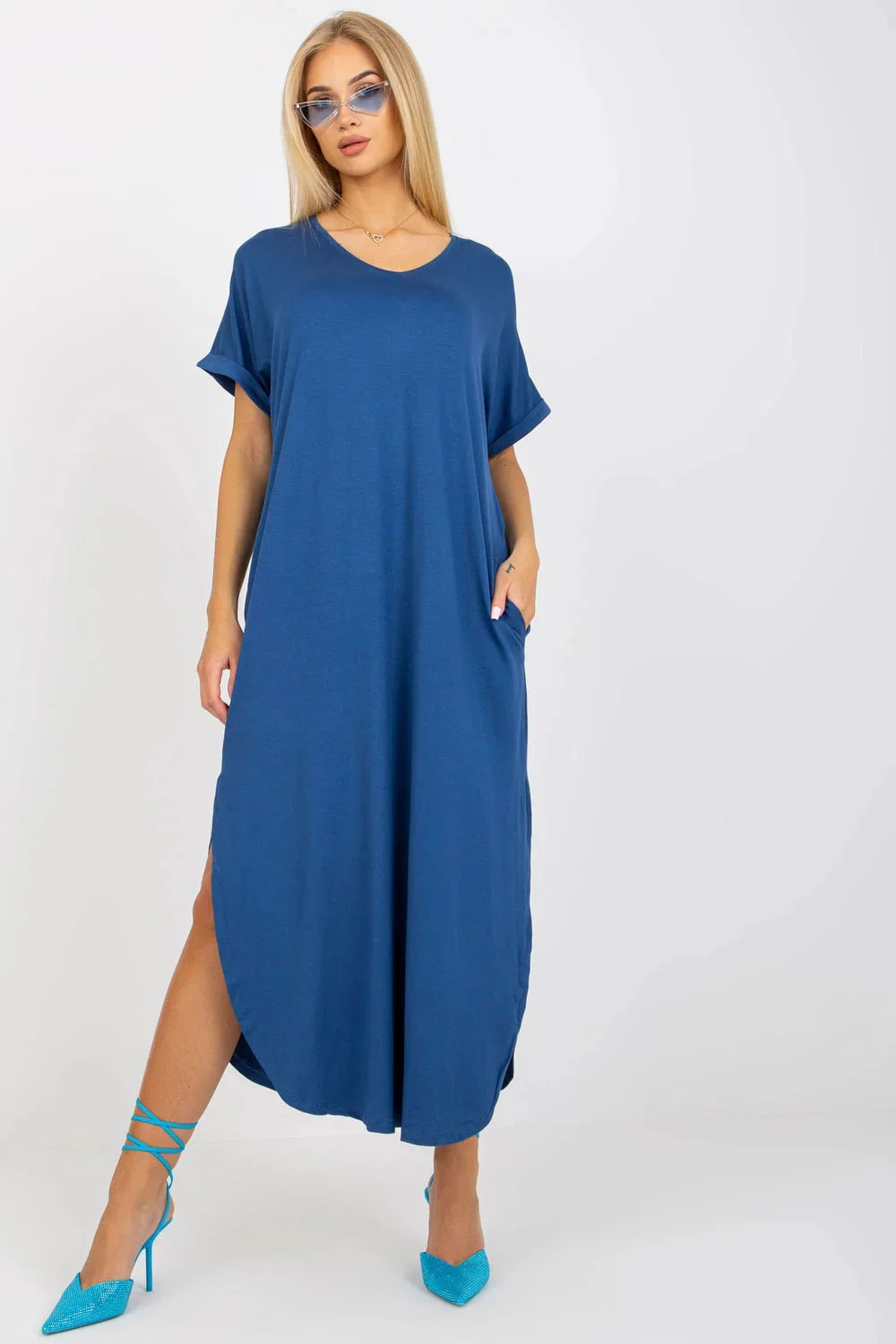 Šaty s krátkými rukávy a kapsami na bocích. Zaoblený lem s rozparky.