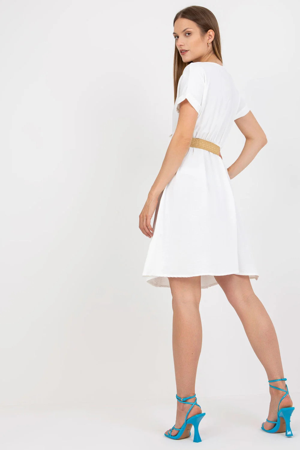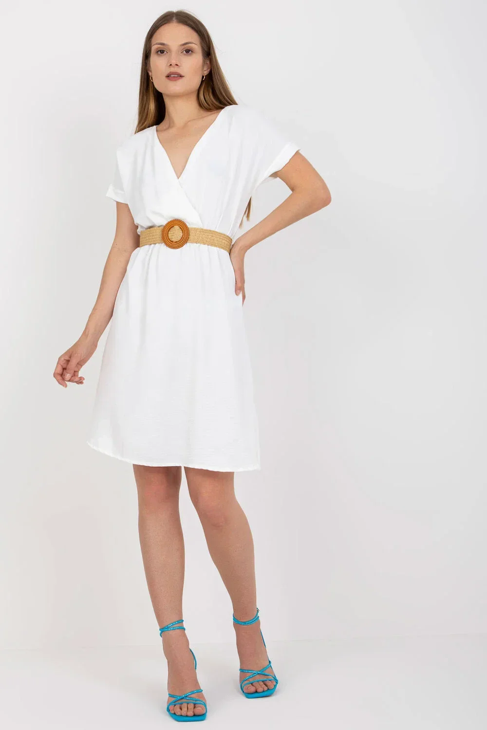 Šaty s obálkovou přední částí a krátkými rukávy. Spodní část šatů je mírně rozšířená. Součástí balení je pletený pásek. Ideální styling pro mnoho příležitostí.