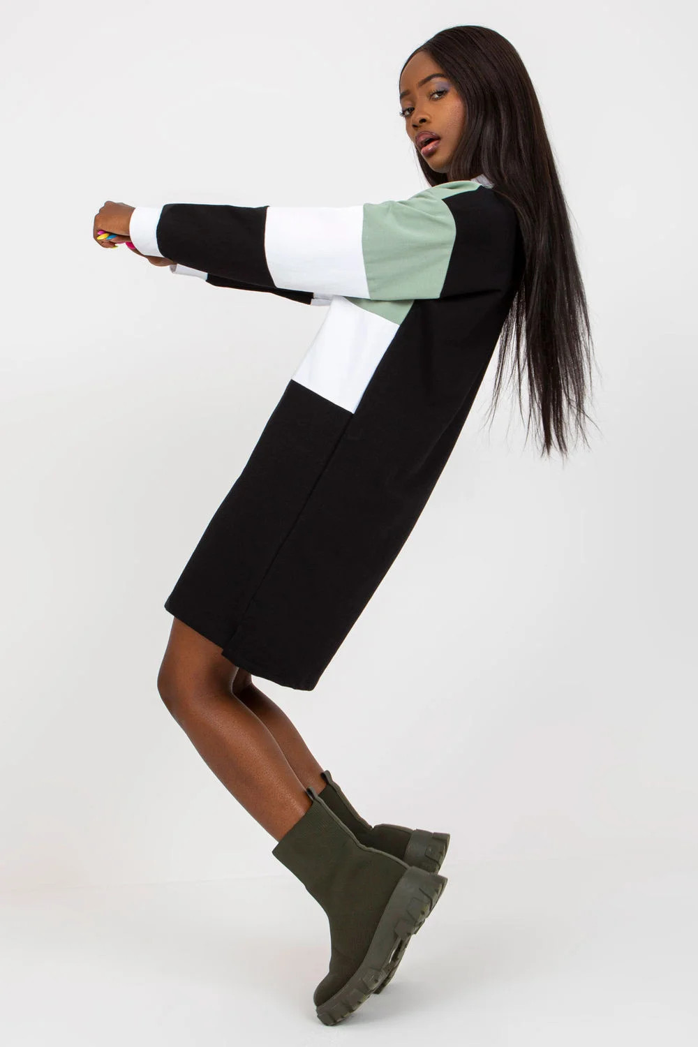 Šaty rovného střihu s dlouhými rukávy a výstřihem do V. Ideální pro každodenní nošení.