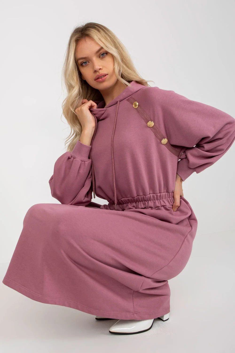 Mikinové šaty s dlouhými rukávy a kapucí. Elastický pas, ozdobné knoflíky na přední straně. Každodenní nabídka.