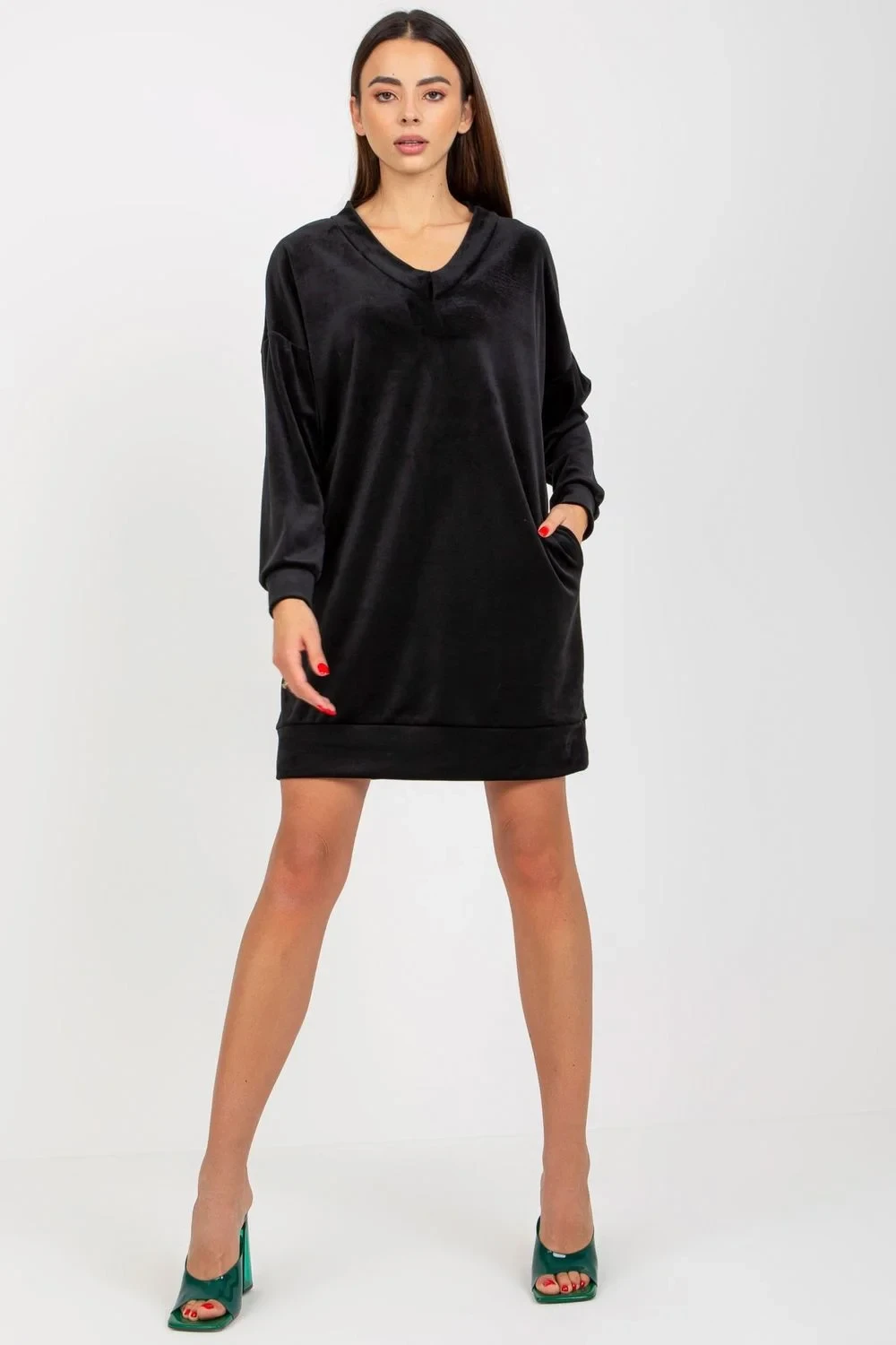 Krátké velurové šaty s dlouhými rukávy a srdíčkovým výstřihem. Ideální pro každý den i mimo něj.
