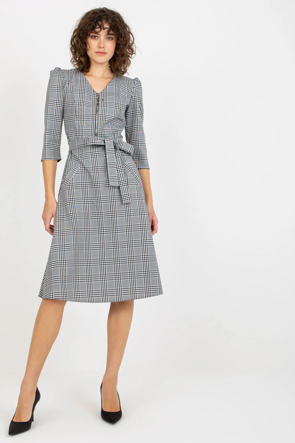 Kostkované šaty na zip se zavazováním v pase. Šaty s 3/4 rukávy a kapsami.