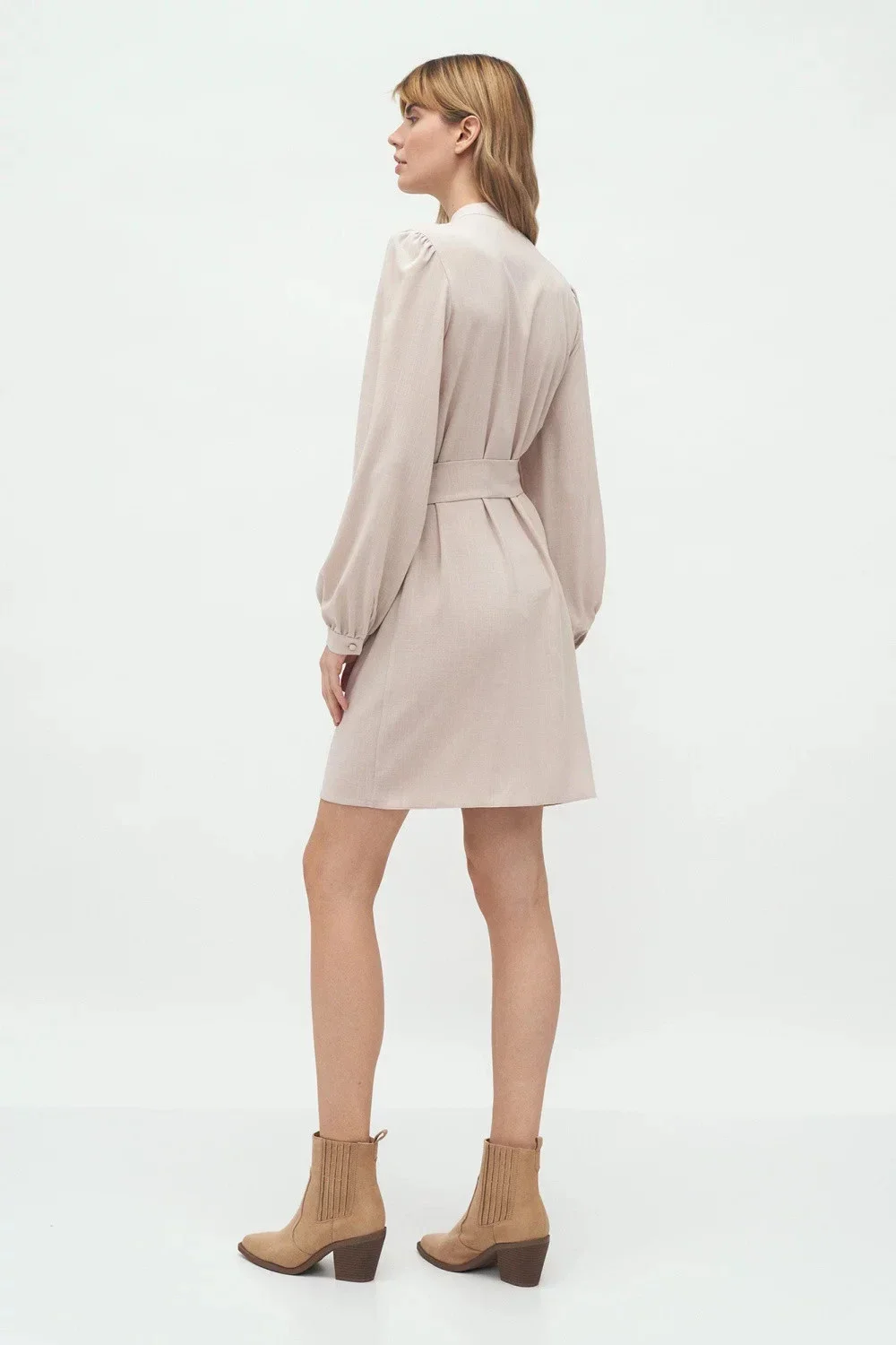 Jednoduché šaty se stojáčkem, ideální pro každou postavu. Pokud máte rádi vypasované šaty, noste je zavázané v pase, pokud ne, pásek si sundejte. Rukávy s mírným řasením na manžetách dodávají jedinečný vzhled. Skvěle se hodí k botám na podpatku a balerínám. Na dotek příjemný materiál zajišťuje vysoký komfort nošení.