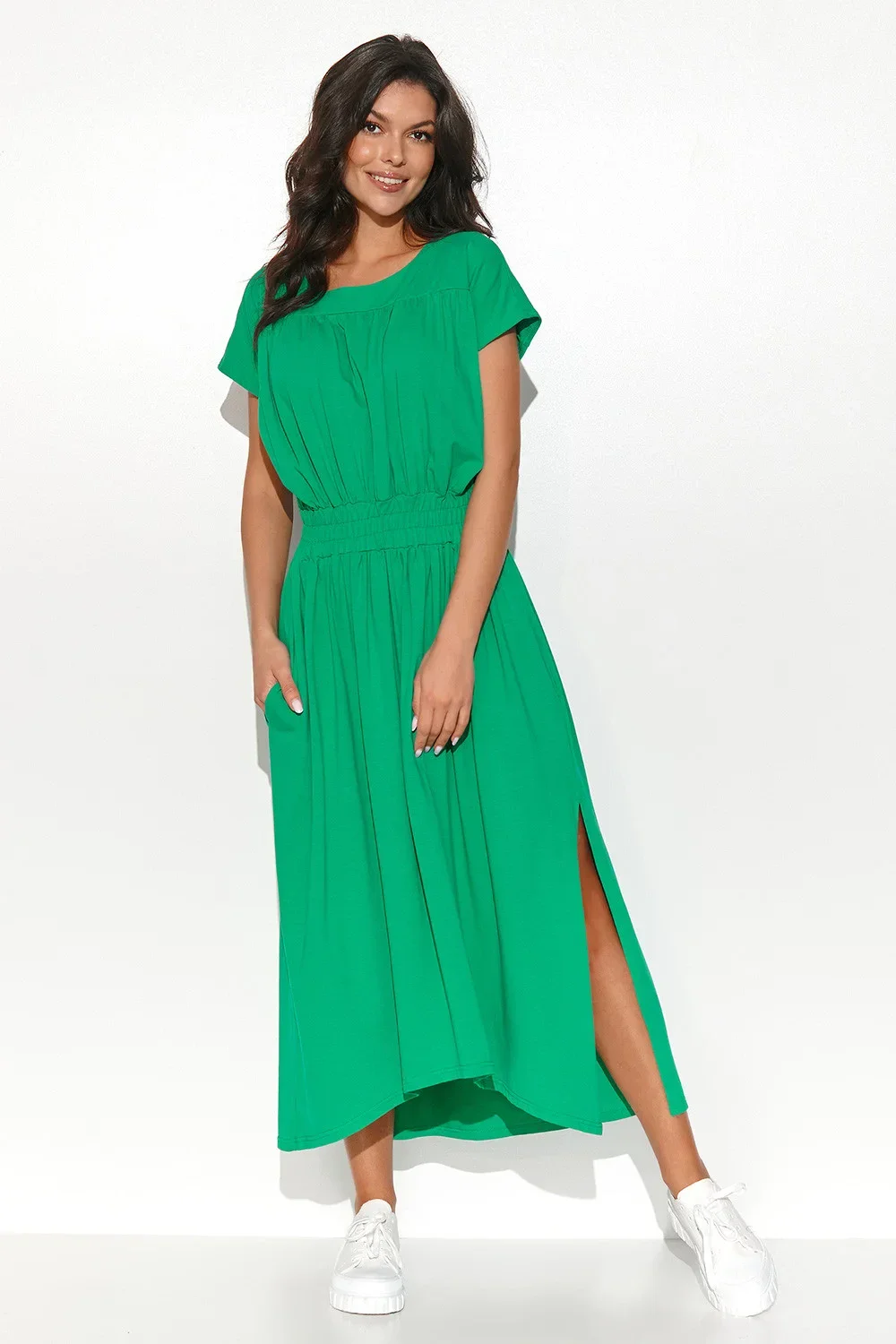 Dlouhé asymetrické šaty ušité z úpletové teplákoviny. Mají kulatý výstřih a v pase jsou opatřeny stahovací gumou. Zadní část šatů je o něco delší než přední, díky čemuž ležérní kreace vypadá na siluetě zajímavě. Téměř po celé délce mají šaty jemné řasení. Na bocích jsou postranní nakládané kapsy. Kulatý výstřih ponechává prostor pro krásný řetízek. Krátké rukávy naopak maskují ramínka spodního prádla. Oblečte si je k oblíbeným botám nebo sandálům a užijte si ležérní, ale elegantní vzhled.