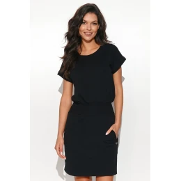 Krátké šaty z mikinového úpletu. Pohodlný ležérní střih se stahovací šňůrkou v pase. Obsahují dvě boční kapsy. Na jedné z nich se nachází půvabná zlatá destička. Kulatý výstřih a krátké rukávy dodávají šatům minimalistický a univerzální vzhled. Jedná se o mimořádně půvabnou každodenní kreaci, kterou můžete stylizovat mnoha způsoby. Sportovně, elegantně nebo pracovně, jak se vám zlíbí. Oblečte si je k teniskám, přibalte k nim lehké dámské sako a vyrazte s přáteli na nákupy nebo vezměte děti na spontánní piknik. V každé situaci budou tyto šaty perfektně fungovat.
