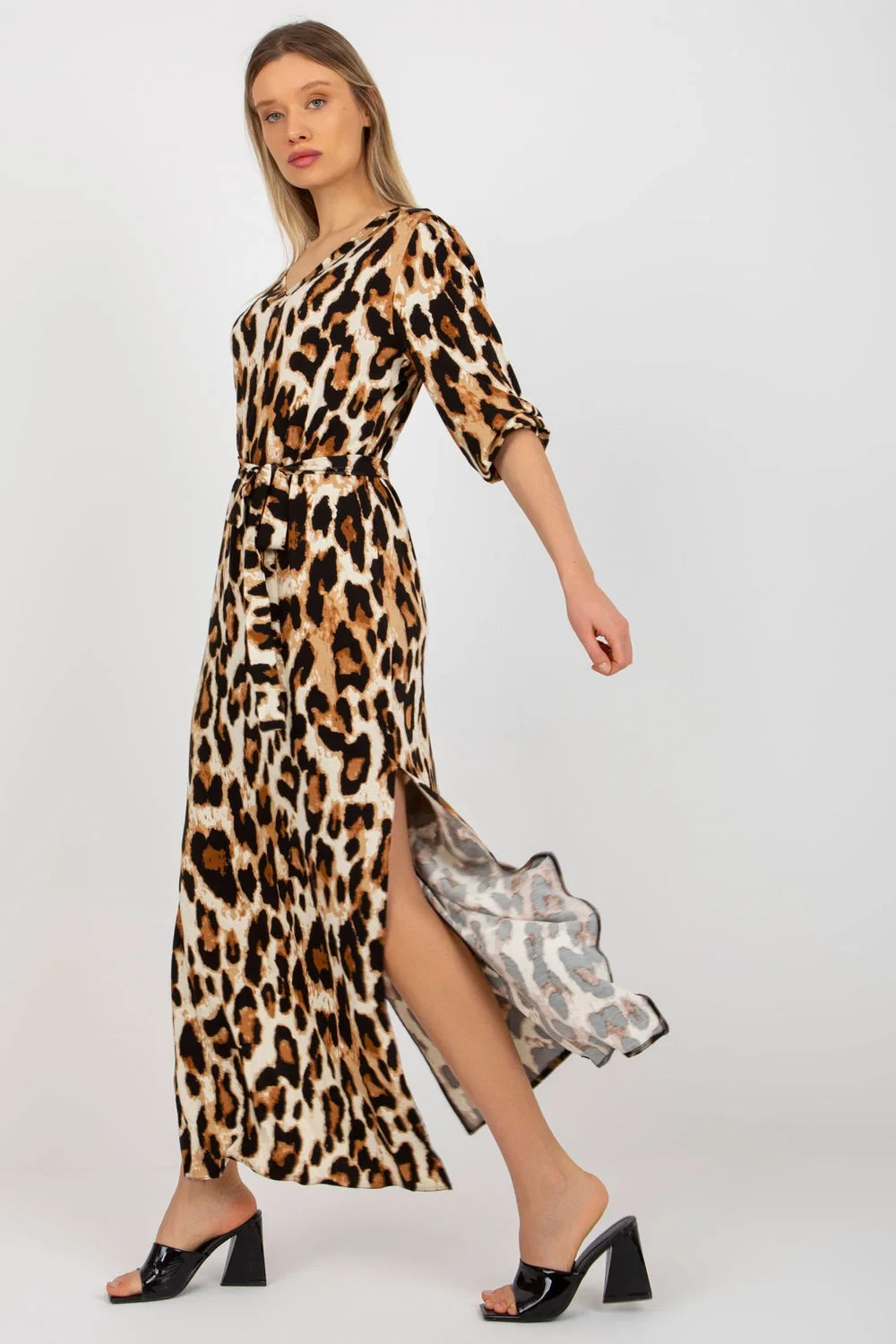 Dlouhé šaty s 3/4 rukávy a srdíčkovým výstřihem. Volné rozparky ve spodní části, doplněné páskem na zavázání.
