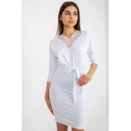 Šaty rovného střihu s 3/4 rukávy a srdíčkovým výstřihem. Výstřih je zdobený ozdobnou krajkou a v pase je pásek na zavázání. Ideální pro mnoho příležitostí.