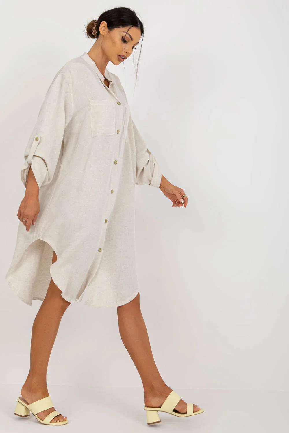 Šaty košilového střihu s dlouhými rukávy. Rukávy lze ohrnout. Spodní část šatů je zakončena půlkulatým lemem. Dvě kapsy na přední straně.